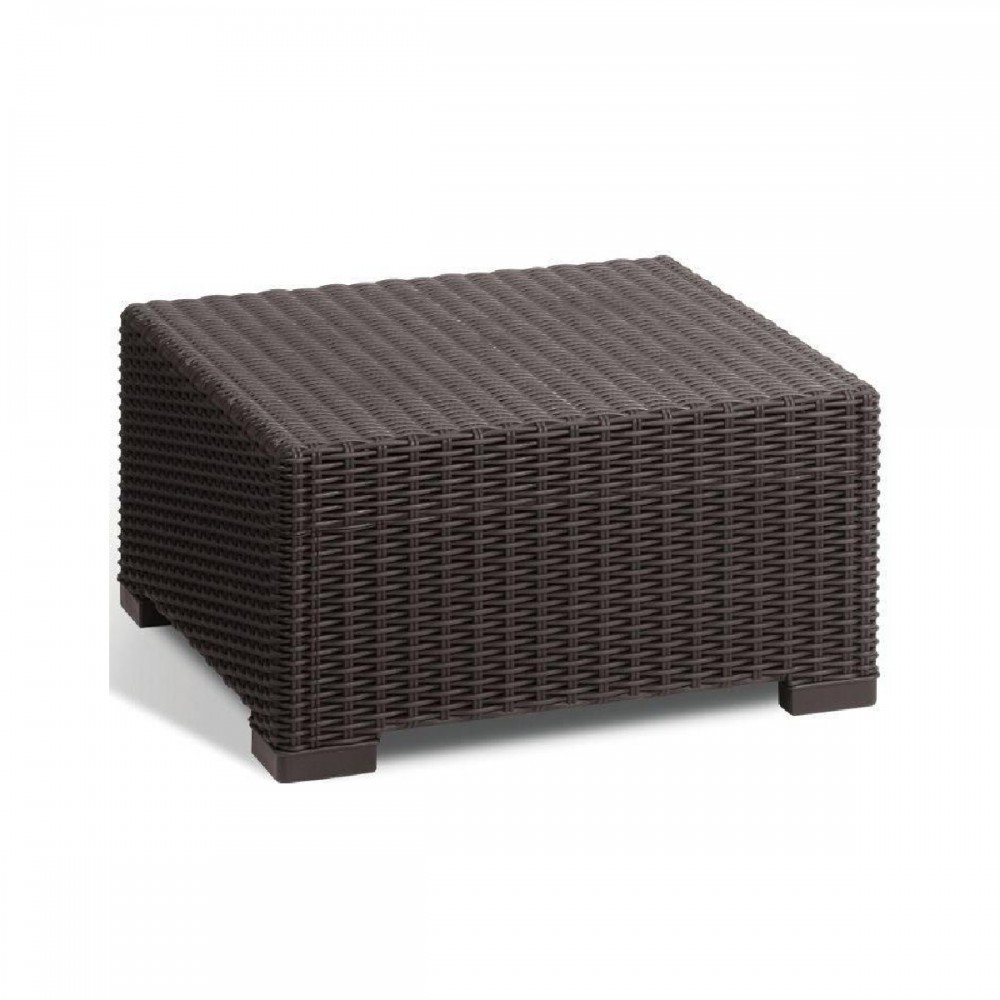 A barna színű asztalt az Allibert márka készítette, amely egy ismert csoportba tartozik (Curver és Keter mellett), amely fröccsöntött műanyag bútorok gyártásával foglalkozik. Ez a bútor vizuálisan emlékeztet a technorattan asztalokra, bár valójában polipropilénből készült. Ezt az anyagot kiváló ellenállás jellemzi a változó időjárási viszonyokkal, a napfénnyel és a hőmérséklet-különbségekkel szemben, ennek köszönhetően az asztal egész évben elérhető. A gyakorlatban ez azt jelenti, hogy egész évben kint állhat, anélkül, hogy elveszítené eredeti megjelenését. A bútorok nem igényelnek karbantartást, a legkeményebb szennyeződéseket is enyhe mosószerrel dúsított vízzel lehet eltávolítani.