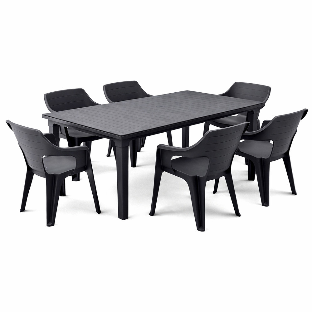 Az Elina 6+1 kerti bútor garnitúra szett grafit színben tökéletes választás családi étkezésekhez, vendégfogadáshoz és minden olyan alkalomhoz, amikor fontos a kényelem és a praktikum.