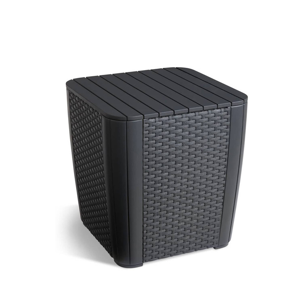 A szett részét képező 2 funkciós asztal nem csupán elegáns, de praktikus eleme is a készletnek. Az asztal teteje felnyitható, így tárolóhelyként is funkcionál, amely ideális különböző kerti kiegészítők és kellékek, mint például italok, könyvek vagy kerti szerszámok elrejtésére.
