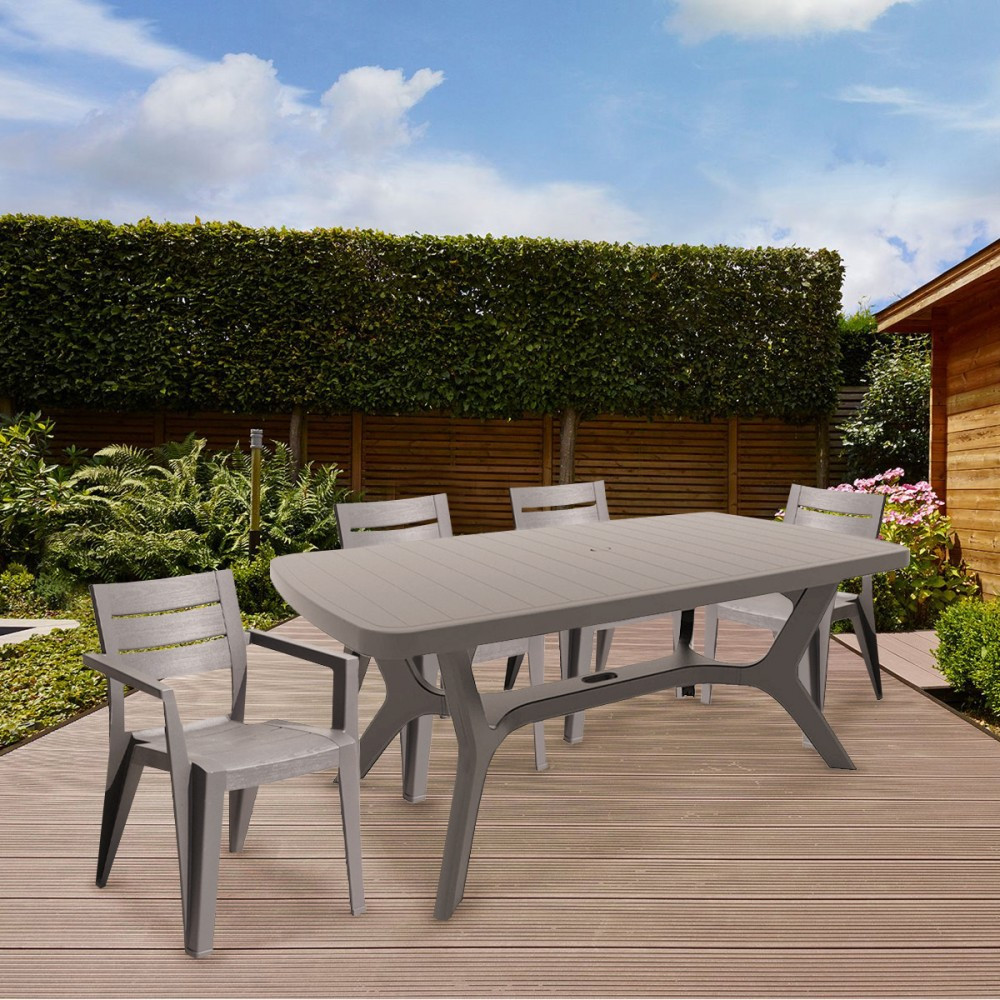 A Juliemore kerti bútor szett kerti asztala az egyszerű, letisztult, modern formájával hívja fel magára a figyelmet. A semleges színének köszönhetően, bármilyen környezetben jól mutat, és könnyen összeegyeztethető más stílusú bútordarabokkal, kiegészítőkkel. A modern, egyszerű formavilághoz könnyű használhatóság társul. Az összeszereléséhez csupán néhány egyszerű mozdulat szükséges. A tisztítása mosószeres vízben áztatott szivaccsal hatékonyan megoldható.