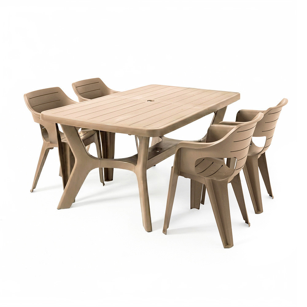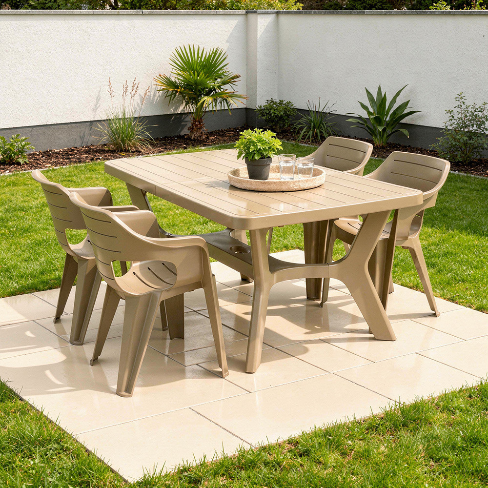 A Natalie 4+1 kerti bútor garnitúra szett cappuccino színben ideális választás, ha egy kényelmes, mutatós és könnyen karbantartható kültéri étkezőszettet keresel teraszra, kertbe vagy udvarra.