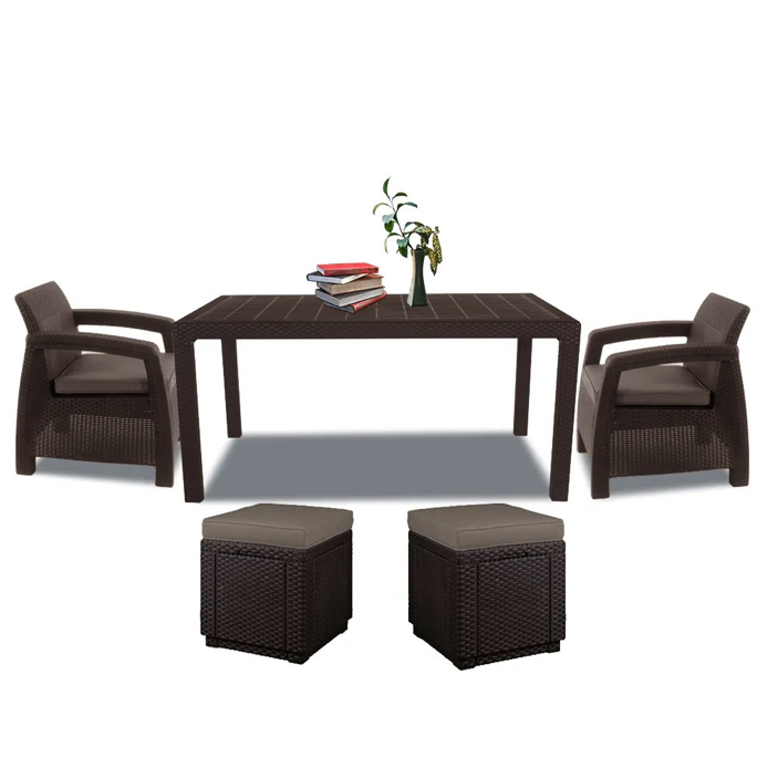 A stílusos Corfu duo cube szabadidő bútor szett maximális kényelmet garantál a felhasználók számára. A szettet modern dizájn jellemez, melyet természetes rattan fonás inspirált. A szett stabilitását és kényelmét szolid felépítésének és átgondolt szerkezetének köszönheti. A bútor szett két egyszemélyes fotelt, két puff és egy asztalt tartalmaz. A Corfu termékvonal - kényelmes párnákkal kapható. A bútorok ellenállnak az időjárás viszontagságainak és az UV sugárzásnak.A bútorokat a Curver gyártja, kiknek termékei megtalálhatóak még Keter márkanév alatt is. A Corfu egy kiváló minőségű európai termék, amely a legjobb minőségű fröccsöntött műanyagból készült.