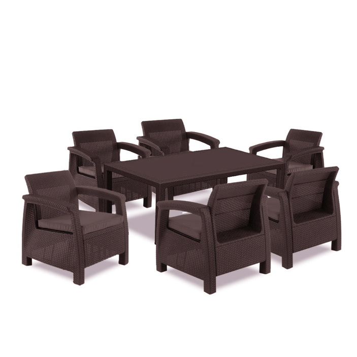 A stílusos Big duo szabadidő bútor szett maximális kényelmet garantál a felhasználók számára. A szettet modern dizájn jellemez, melyet természetes rattan fonás inspirált. A szett stabilitását és kényelmét szolid felépítésének és átgondolt szerkezetének köszönheti. A bútor szett hat egyszemélyes fotelt és egy asztalt tartalmaz. A Big termékvonal - kényelmes párnákkal kapható. A bútorok ellenállnak az időjárás viszontagságainak és az UV sugárzásnak.A bútorokat a Curvergyártja, kiknek termékei megtalálhatóak még Keter márkanév alatt is. A Big egy kiváló minőségű európai termék, amely a legjobb minőségű fröccsöntött műanyagból készült.