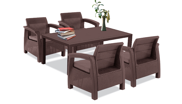 A stílusos Corfu duo szabadidő bútor szett maximális kényelmet garantál a felhasználók számára. A szettet modern dizájn jellemez, melyet természetes rattan fonás inspirált. A szett stabilitását és kényelmét szolid felépítésének és átgondolt szerkezetének köszönheti. A bútor szett négy egyszemélyes fotelt és egy asztalt tartalmaz. A Corfu termékvonal - kényelmes párnákkal kapható. A bútorok ellenállnak az időjárás viszontagságainak és az UV sugárzásnak.A bútorokat a Curver gyártja, kiknek termékei megtalálhatóak még Keter márkanév alatt is. A Corfu egy kiváló minőségű európai termék, amely a legjobb minőségű fröccsöntött műanyagból készült.