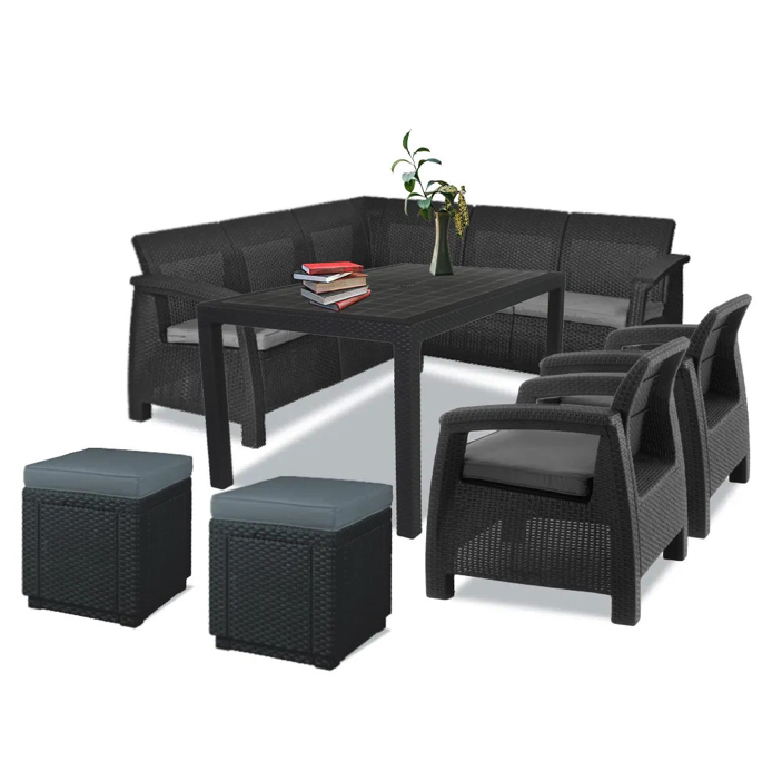 A stílusos Relax duo cube szabadidő bútor szett maximális kényelmet garantál a felhasználók számára. A szettet modern dizájn jellemez, melyet természetes rattan fonás inspirált. A szett stabilitását és kényelmét szolid felépítésének és átgondolt szerkezetének köszönheti. A bútor szett egy L alakú kanapét, két egyszemélyes fotelt, két puffot és egy asztalt tartalmaz. A Relax termékvonal - kényelmes párnákkal kapható. A bútorok ellenállnak az időjárás viszontagságainak és az UV sugárzásnak.A bútorokat a Curver gyártja, kiknek termékei megtalálhatóak még Keter márkanév alatt is. A Fiesta egy kiváló minőségű európai termék, amely a legjobb minőségű fröccsöntött műanyagból készült.