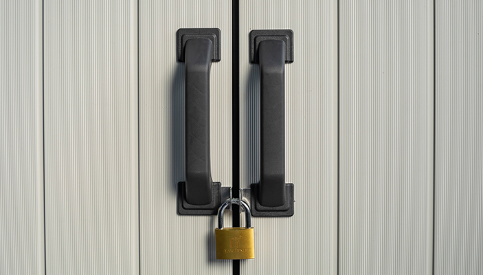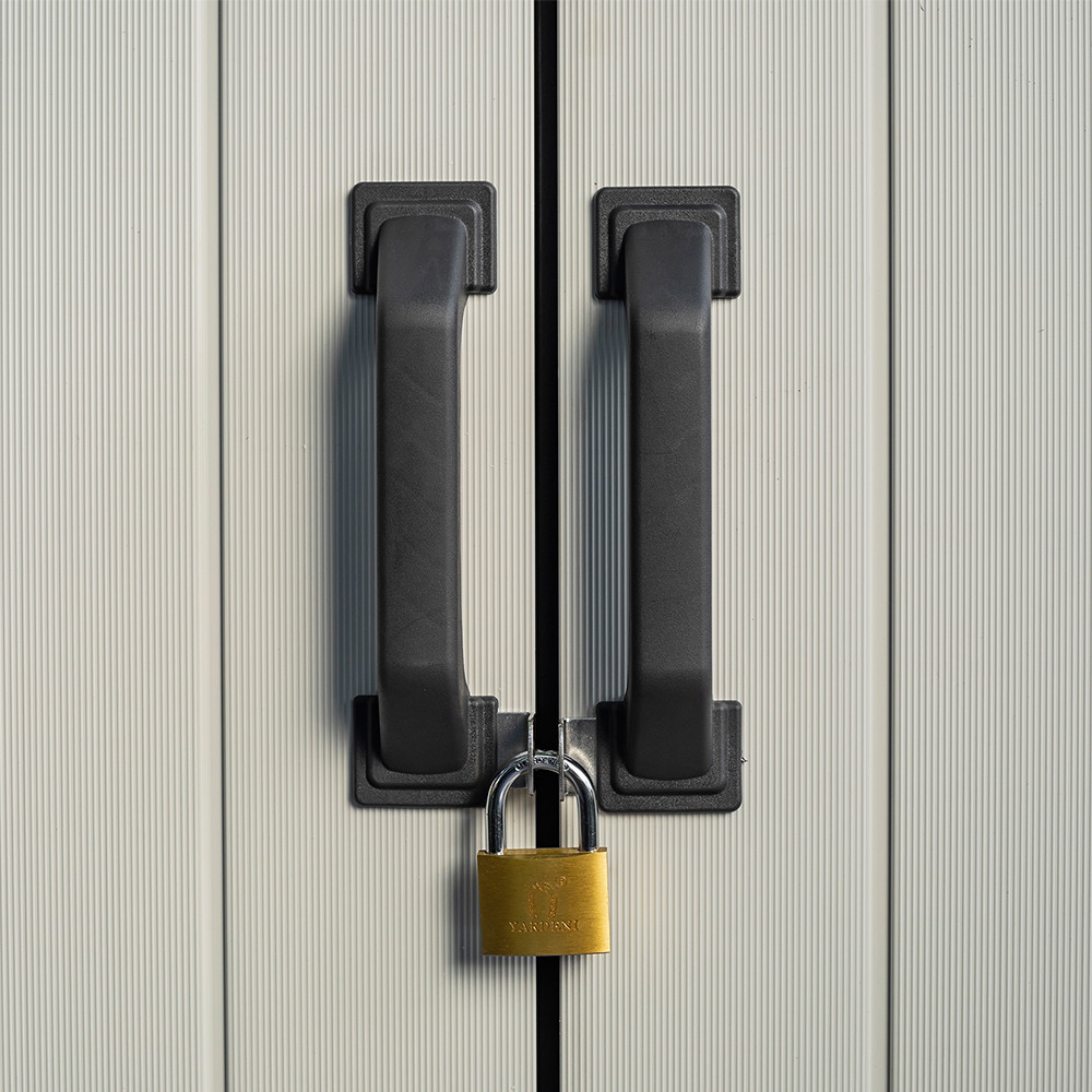 A Keter High Store kerti tároló dupla ajtaja reteszzárral rendelkezik. Elég, ha saját kezűleg vásárol egy lakatot, hogy megvédje a szekrényt a nemkívánatos felhasználóktól. A Kete High Store karbantartásmentes egész évben. A tisztításhoz vizet és enyhe tisztítószereket használhatsz.