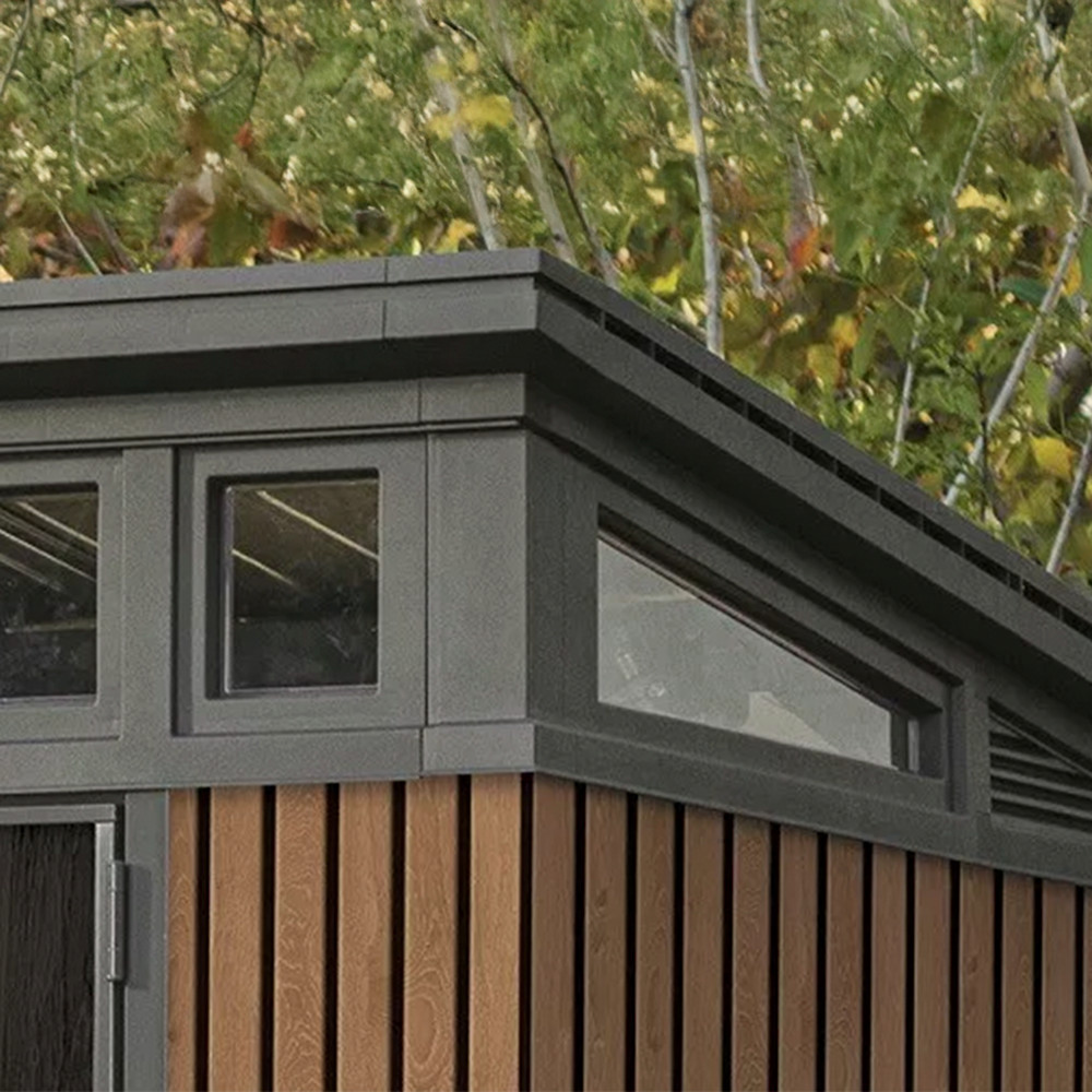 A Decocoat technológiával készült műanyag panelek természetes fa hatást keltenek, miközben teljesen gondozásmentesek. A megerősített acélszerkezet stabilitást biztosít, a lakattal zárható ajtó pedig extra védelmet nyújt. Méretei: 216x218x226 cm