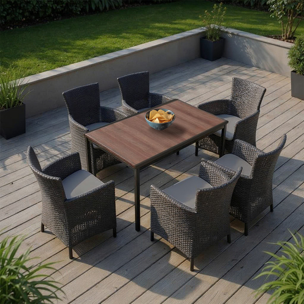Szett tartalma: 1 db Porto 160 kerti asztal + 6 db Iowa Rattan Style kerti fotel párnávalAsztal mérete: 159 × 95 × 75 cmFotel mérete: 62 × 60 × 89 cmSzínek: Asztal – dió (fa hatású), székek – grafitAnyag: Polipropilén műanyag (UV-stabilizált, vízálló)Kialakítás: Rattan hatású, karfás fotelek kényelmes ülőpárnávalTulajdonságok: Időtálló, könnyen tisztítható, tartósAlkalmazási terület: Terasz, kert, erkély, nyaraló, kávézókKényelem, ami stílust visz a kertedbeA Nadia 6+1 kerti garnitúra tökéletes választás azoknak, akik szeretnének egy elegáns, mégis ellenálló kültéri bútor szettet, ahol a dizájn és a funkcionalitás kéz a kézben jár. A faerezetes felületű, időjárásálló Porto 160 asztal dió színben és a párnás Iowa fotelgrafit színben harmonikus és igényes összhatást alkot, amely bármilyen kertben vagy teraszon megállja a helyét.A székekhez tartozó ülőpárna kellemes komfortérzetet nyújt, így egy nyári reggeli vagy esti borozás is kifejezetten kényelmessé válik. Az ülőfelület és háttámla enyhén döntött, ergonomikus kialakítású – nem kell kompromisszumot kötni a kényelem rovására.Időtálló minőség, karbantartásmentes nyugalomA szett minden eleme időtálló: a polipropilénből készült székek nem szívják magukba a nedvességet, nem vetemednek, és nem veszítik el a színüket az UV-sugárzás hatására sem. A Porto asztal DecoCoat™ bevonata biztosítja a természetes fa hatást és a karcállóságot – mindezt anélkül, hogy bármilyen külön karbantartásra szükség lenne.A székek könnyen tisztíthatók, ahogy az asztal is – egy nedves törlőkendő vagy enyhe tisztítószer elegendő a makulátlan tisztasághoz.Ideális étkező- és pihenősarok 6 fő részére – családi reggelitől a baráti borozásigA 160 cm hosszú asztallap lehetőséget ad 6 fő kényelmes elhelyezésére, így vendégek fogadásakor sem kell kompromisszumot kötnöd. A modern megjelenésű fekete fém lábak stabilitást biztosítanak, és nem hajlamosak a rozsdásodásra.A rattan hatású székek természetes textúrája barátságosabbá teszi a kültéri teret, míg a párnák színárnyalatban finoman elütnek, így még inkább kiemelik a dizájn karakterét.Kinek ajánljuk a Nadia 6+1 kerti garnitúrát?Akik számára fontos a hosszú távú tartósság és az időjárásállóságAkik nem akarnak évente új garnitúrát vásárolniAkiknek számít a kényelem – a magas támlás fotel és a párna garantáltan gondoskodik rólaAkik szeretik a fa hatású, de karbantartásmentes megoldásokatAkik stílusos, de funkcionális kültéri bútort keresnek otthonra, nyaralóba vagy vendéglátóhelyreTedd otthonosabbá a kerted vagy teraszod a Nadia 6+1 kerti garnitúra szettel – ahol a forma, a funkció és a kényelem egy tökéletes egésszé áll össze!