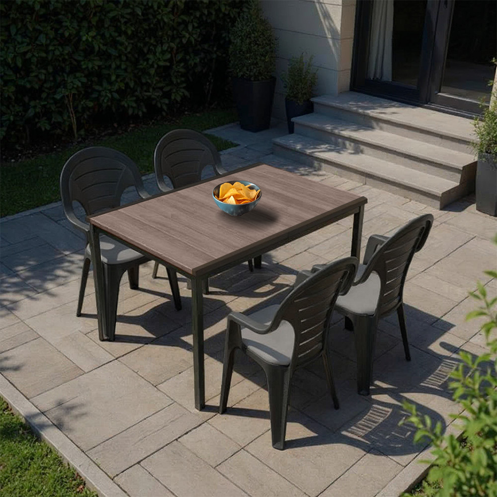 Kert, ahol valóban pihenhetsz – A Lagos 4+1 garnitúra előnyeiA Lagos 4+1 kerti bútor szett a funkcionalitás és az esztétikum tökéletes találkozása. Ha olyan szettet keresel, ami nem csak szép, hanem valóban tartós is, akkor megtaláltad. A Porto 160 műanyag asztal és a négy Bonaire grafit szék együttese minden alkalomra ideális: legyen szó reggeliről a teraszon, családi grillezésről vagy baráti vacsoráról a kertben.A dió színű asztallap természetes hatást kelt, ami remekül harmonizál a grafit székek letisztult formavilágával. A szett elegáns, mégis praktikus – és ami a legjobb: hosszú évekig gondtalanul használhatod.Időjárásálló polipropilén & masszív fémváz – így bírja a Siena garnitúra az elemeketA Lagos 4 + 1 kerti szett asztallapja – a Porto 160 modell – DecoCoat™ eljárással készült, fahatású polimerből. Ez a speciális, UV-stabilizált műanyag nem szívja magába a vizet, nem vetemedik, és a nyári forróság vagy a téli fagy sem tesz benne kárt. Az asztallapot egy porszórt, korrózióálló fémváz merevíti, így egyszerre kapod meg a természetes megjelenést és az acélos tartósságot.Tartós anyaghasználat, amely valóban kiállja az idő próbájátPorto 160 asztal:A DecoCoat™ technológiával készült asztallap nemcsak látványra fa, hanem tapintásra is meglepően természetes. Anyagának köszönhetően ellenáll az átlagos időjárási viszonyoknak. A fekete fémváz extra stabilitást nyújt, korróziómentes és jól tűri az időjárás viszontagságait.Bonaire székek:A székek nagy sűrűségű polipropilénből készülnek, mely nem csak erős, hanem rugalmas is – így kényelmesen támasztják meg a hátat. Az anyag nem fakul ki a nap hatására, és az eső sem tesz kárt benne. A könnyű, egymásba rakható kialakítás miatt ideális akár kisebb helyekre is.Miért érdemes a Lagos 4+1 szettet választani?Nem kell karbantartani: nincs festés, lakkozás vagy fedés – csak élvezd!Időtálló és strapabíró: időtállóKényelmes és tágas: 4 főre tökéletes, 6 főre is kényelmesEsztétikus megjelenés: fa hatású dizájn, letisztult grafit székekKönnyű tárolás: a székek egymásba rakhatókGyors tisztítás: mosószeres víz és egy rongy – ennyi elégKinek ajánljuk a Lagos 4+1 garnitúrát?Akik stílusos, modern megjelenésű kültéri bútorra vágynakAkik fontosnak tartják a hosszú élettartamot és karbantartásmentességetAkik 4–6 fős családi vagy baráti összejövetelekre keresnek kényelmes megoldástAkiknek kevés a hely, de nem akarnak lemondani a minőségi kerti élményekrőlAkik nem szeretnének évente új bútort venniNe vesződj többé a fakuló, rozsdásodó, billegő bútorokkal!Válaszd a Lagos 4+1 kerti bútor garnitúrát, és élvezd a kert nyújtotta szabadságot, gondtalanul – már az első naptól kezdve.