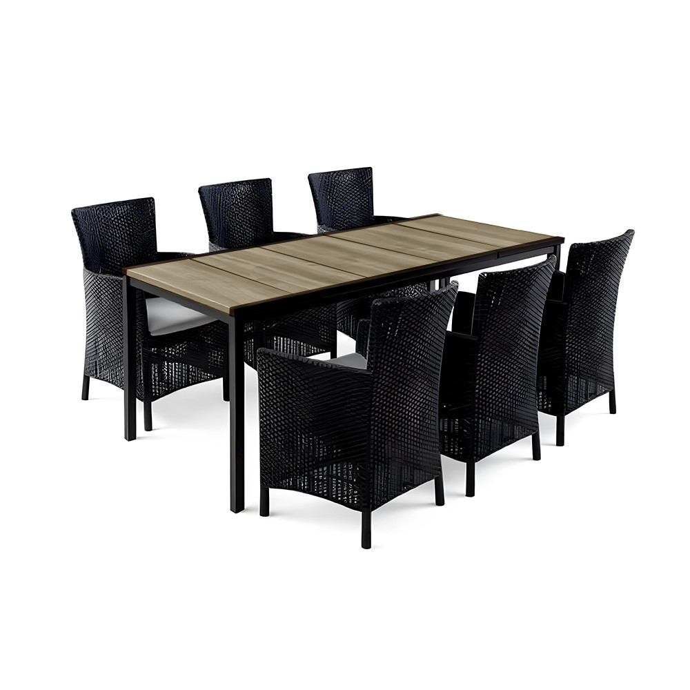 A Nadia Large garnitúrában minden benne van, ami egy gondtalan kültéri étkezéshez, nyári estéhez vagy baráti összejövetelhez kell. A hat darab kényelmes, kartámaszos Iowa fotelhez egy tágas, 200 × 95 cm-es Porto étkezőasztal tartozik – mindez időjárásálló, UV-védett, stílusos kivitelben.