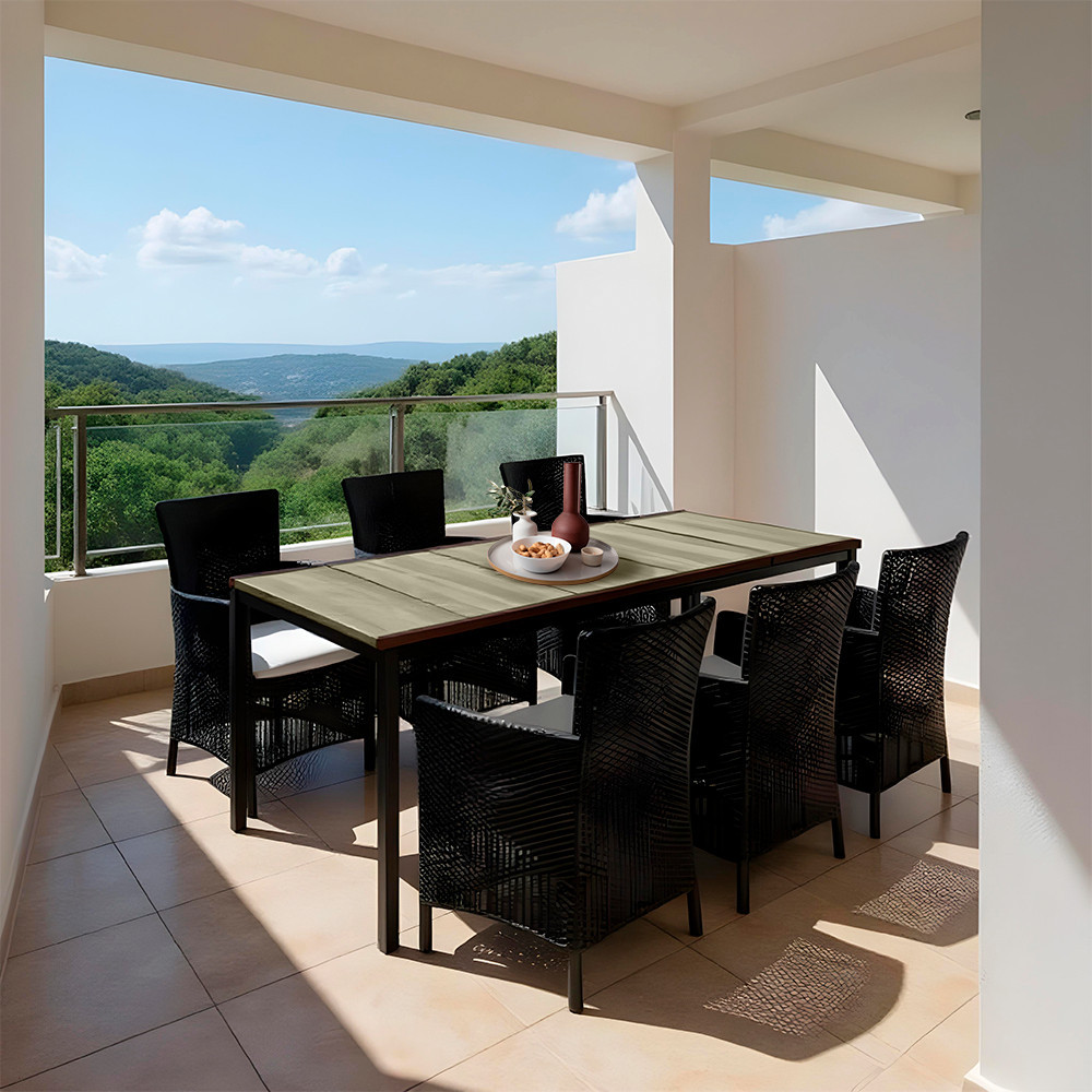 A Porto 200 asztal nem csak látványos, de rendkívül praktikus is. A 200 × 95 cm-es méretének köszönhetően kényelmesen elfér körülötte akár hat fő, míg a 75 cm-es magasság ideálisan illeszkedik a fotelekhez. A DecoCoat™ technológiával készült műanyag lap faerezetes felülete kőris színben természetes látványt ad, miközben teljesen karbantartásmentes, UV-, víz- és karcálló. A fekete porszórt fémváz stabilitást és modern karaktert kölcsönöz.