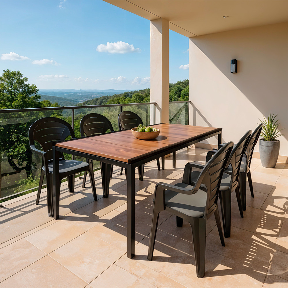 Egyetlen, nagyméretű szettben mindent megkapsz, ami a hétköznapi reggelitől a baráti grillpartiig kell: hat Bonaire rakásolható karfás szék + egy 200 × 95 cm-es Porto étkezőasztal – prémium műanyagból, kompromisszumok nélküli kényelemmel és nulla karbantartással.