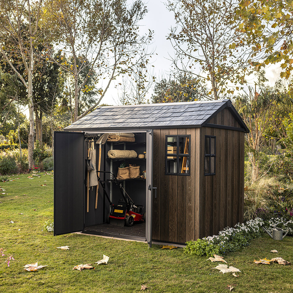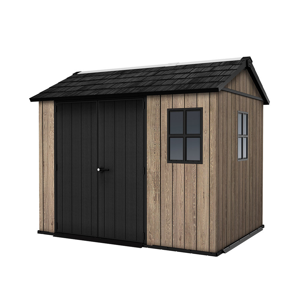 Az Apex 7,5x9/9x7,5 műanyag kerti ház a modern kialakítást ötvözi a praktikus használhatósággal. A tágas belső tér lehetővé teszi kerti szerszámok, gépek, bútorok vagy sportfelszerelések rendszerezett tárolását, miközben a természetes hatású felület esztétikusan illeszkedik a kerti környezetbe.