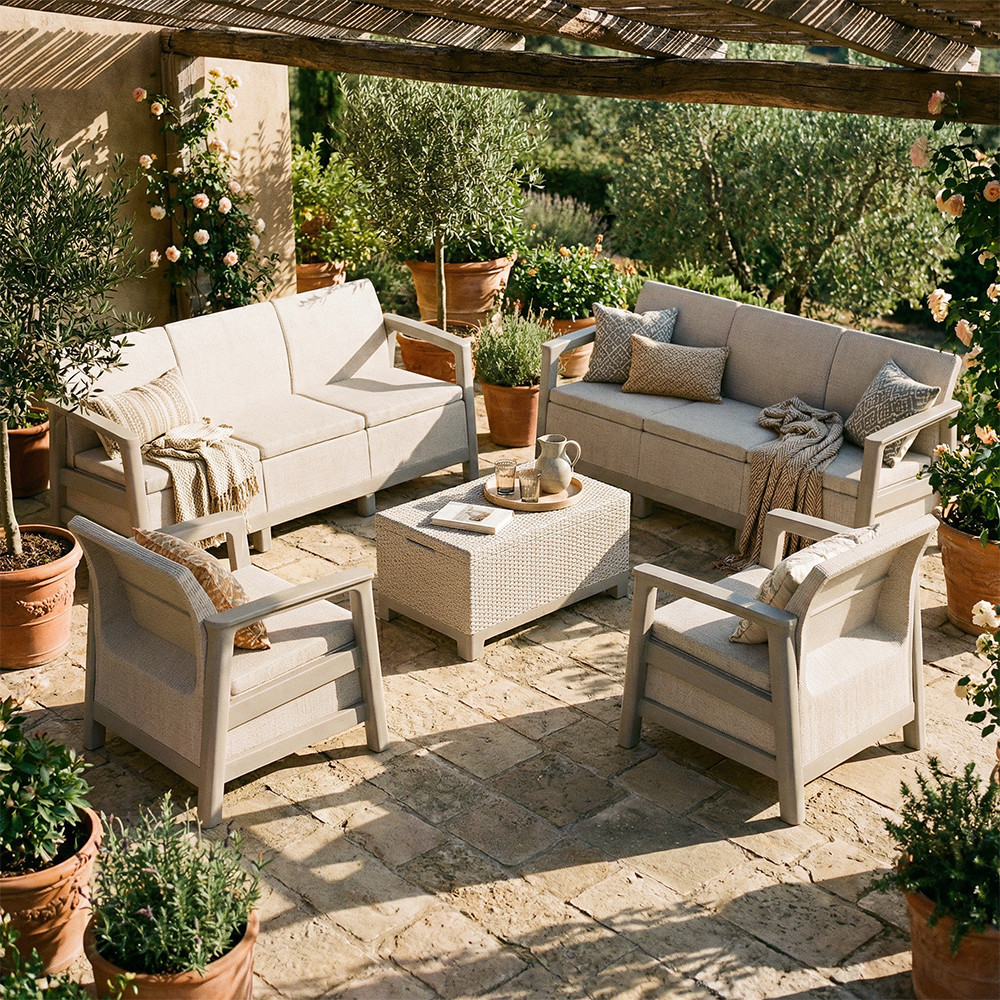A szett kényelmes beszélgetősarkot alakít ki a kertben vagy a teraszon. Egységes, modern kültéri nappali hozható létre vele, miközben a tárolós asztal praktikus helyet biztosít a kiegészítőknek. Időjárásálló, gondozásmentes megoldás, amely rendezetten és átgondoltan formálja a kültéri teret.
