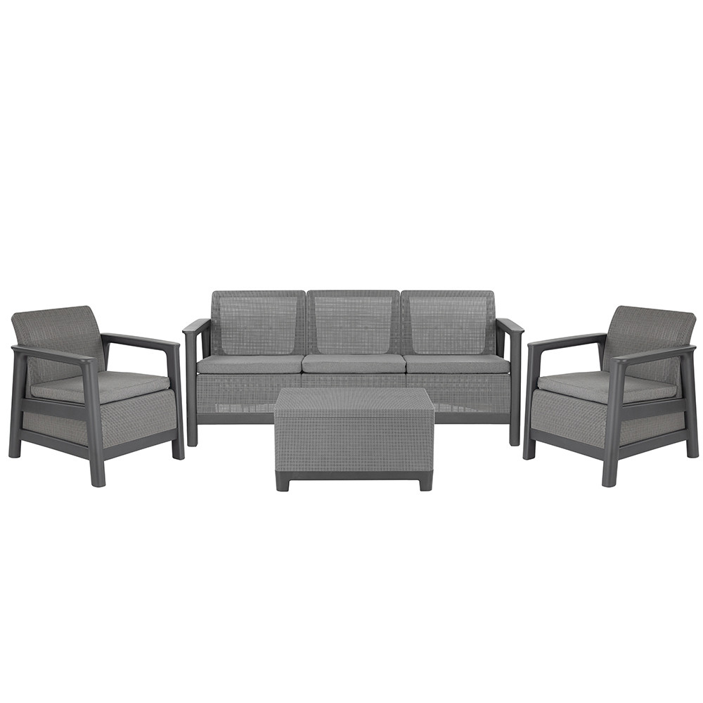 A szett kényelmes beszélgetősarkot alakít ki a kertben vagy a teraszon. Egységes, modern kültéri nappali hozható létre vele, miközben a tárolós asztal praktikus helyet biztosít a kiegészítőknek. Időjárásálló, gondozásmentes megoldás, amely rendezetten és átgondoltan formálja a kültéri teret.