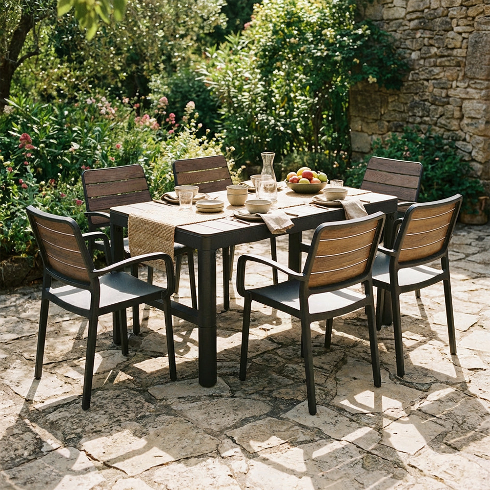 A DecoCoat technológiának köszönhetően az asztal természetes fa hatású felületet kapott, amely elegáns megjelenést biztosít a kertben vagy a teraszon. A felület ellenáll a karcolásoknak és a mindennapi használatból eredő igénybevételnek.