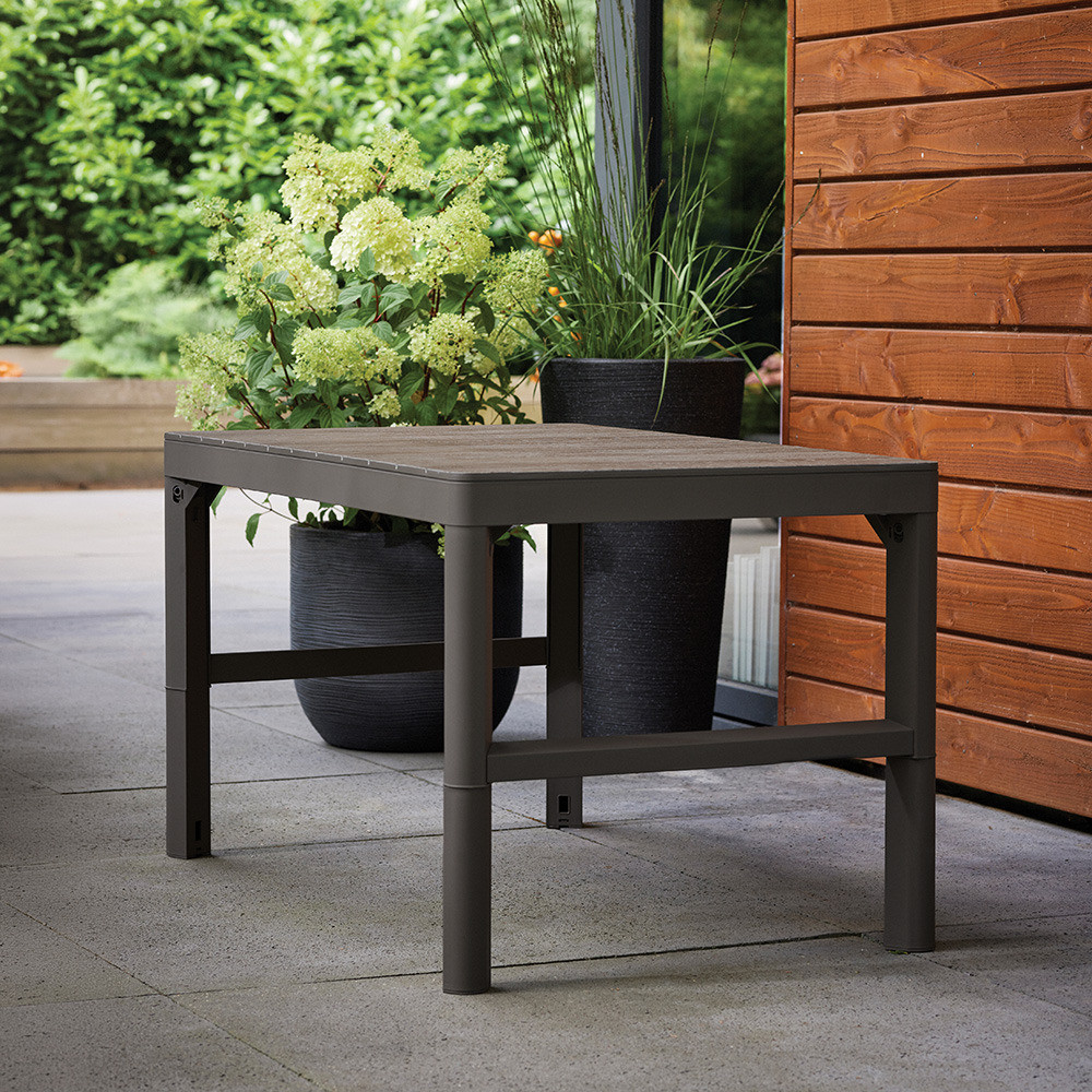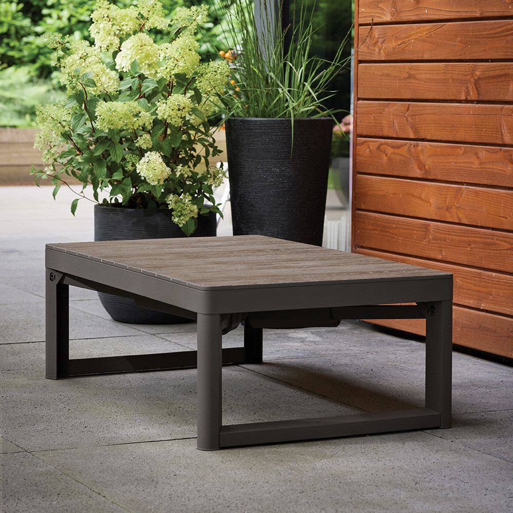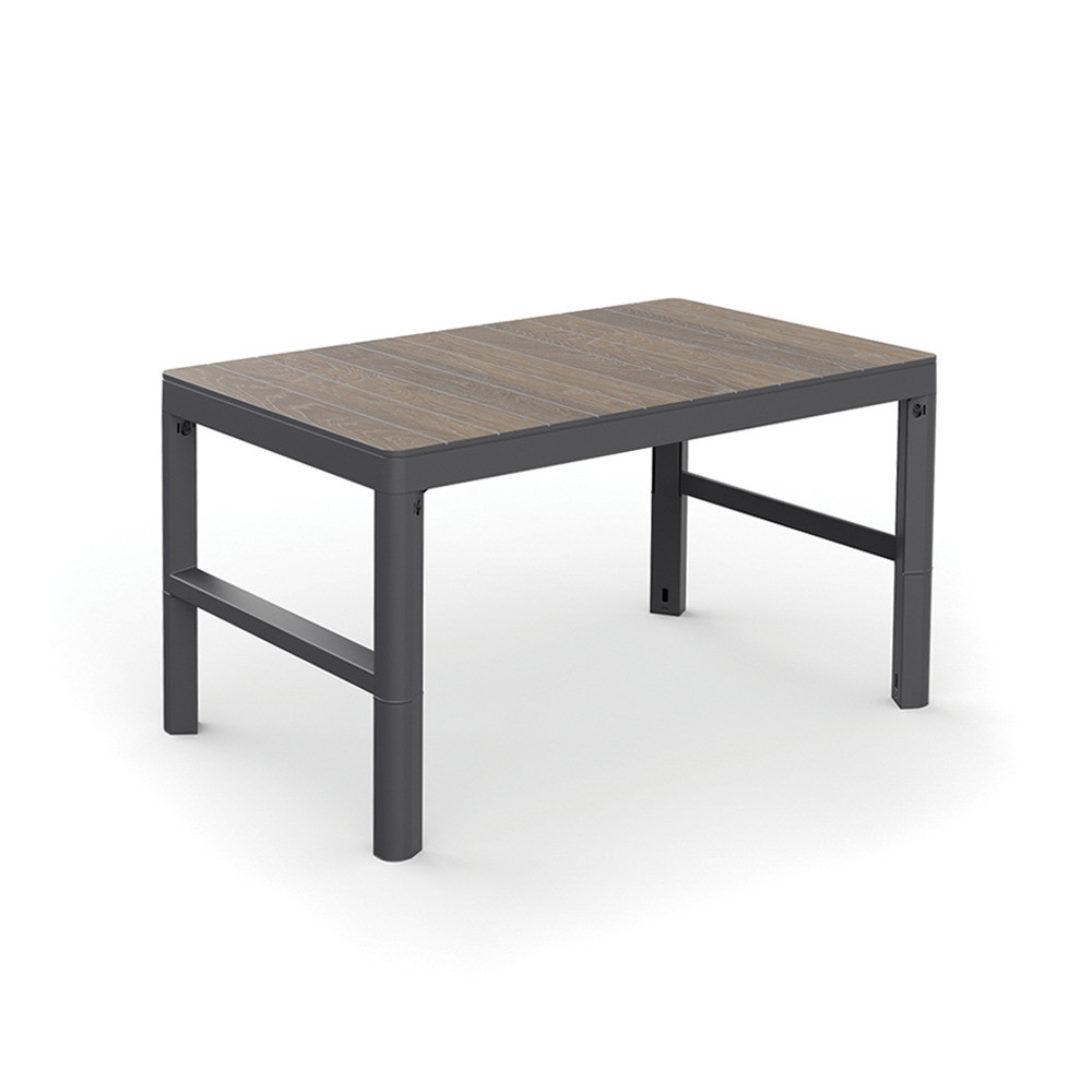 A DecoCoat technológiának köszönhetően az asztal természetes fa hatású felületet kapott, amely elegáns megjelenést biztosít a kertben vagy a teraszon. A felület ellenáll a karcolásoknak és a mindennapi használatból eredő igénybevételnek.