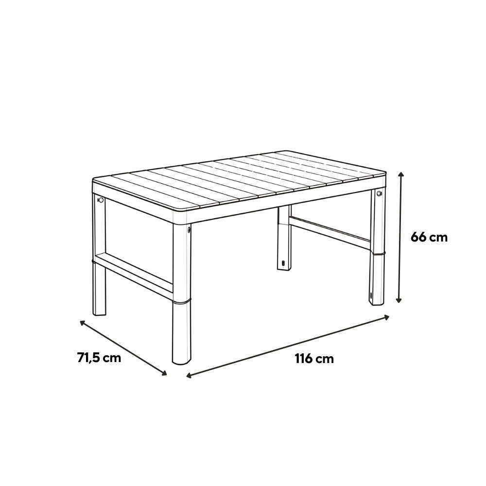 A Deco Lyon kerti asztal különleges kialakításának köszönhetően két különböző magasságban használható. Alacsony állásban kényelmes dohányzóasztalként, magasabb pozícióban pedig praktikus étkezőasztalként szolgál, így könnyen alkalmazkodik a különböző igényekhez.