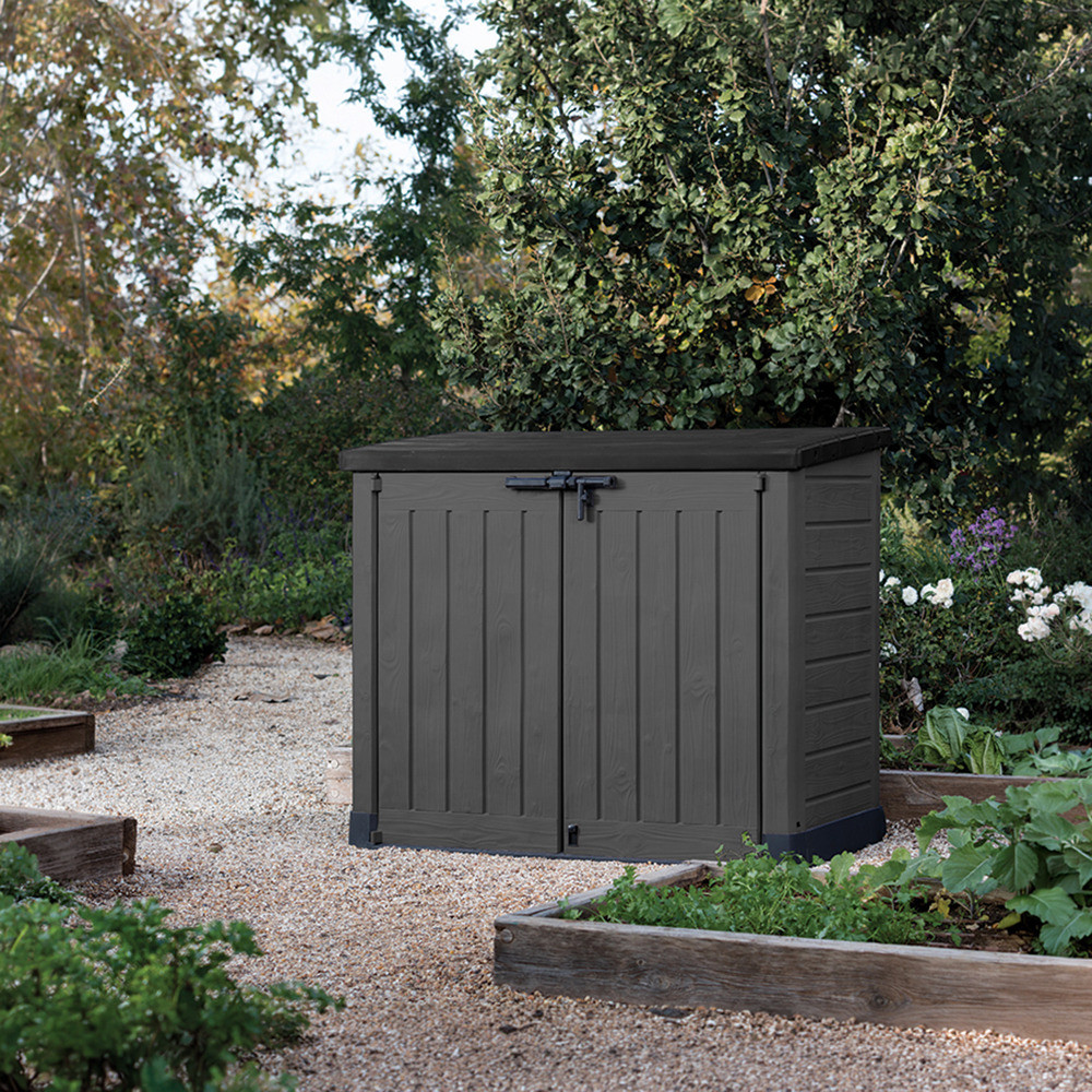 A Store It Out Max műanyag kerti tároló 1200 L ideális választás, ha nagy méretű kültéri tárolási megoldásra van szükség. A 1200 literes kapacitás elegendő helyet biztosít kerti szerszámok, kerti gépek, párnák vagy akár több hulladéktároló elhelyezésére. A felnyitható tető és az elülső, kétszárnyú ajtó kényelmes hozzáférést biztosít a tárolt eszközökhöz.