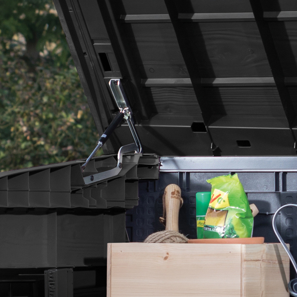 A sötétszürke szín modern, visszafogott megjelenést kölcsönöz a tárolónak, amely könnyen illeszkedik különböző kertépítészeti stílusokhoz. Kompakt, mégis nagy kapacitású kialakítása lehetővé teszi, hogy a kert rendezett és átlátható maradjon.