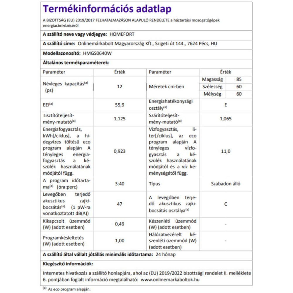 A HOMEFORT HMGS0640W (fehér) szabadonálló mosogatógép 12 terítéket képes tisztává varázsolni! 3 fő tervezési szempontja a hosszú élettartam, megbízhatóság és az egyszerű kezelhetőség!