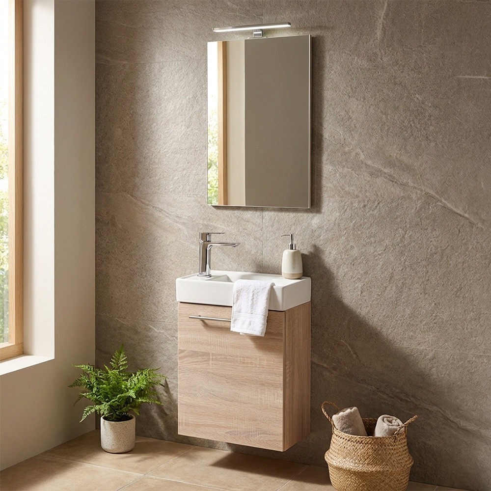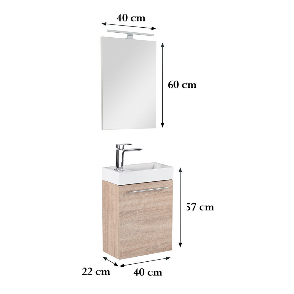 Kis helyigényű minőségi fürdőszoba bútor kisebb fürdőszobákba, vagy mellékhelyiségbe tökéletes kézmosónak. A termék kiváló minőségű bútorlapból készül és színben passzoló élzárókkal van ellátva. A fürdőszoba bútor felfüggesztett kivitelben kapható. A mosdó fehér öntött márvány.