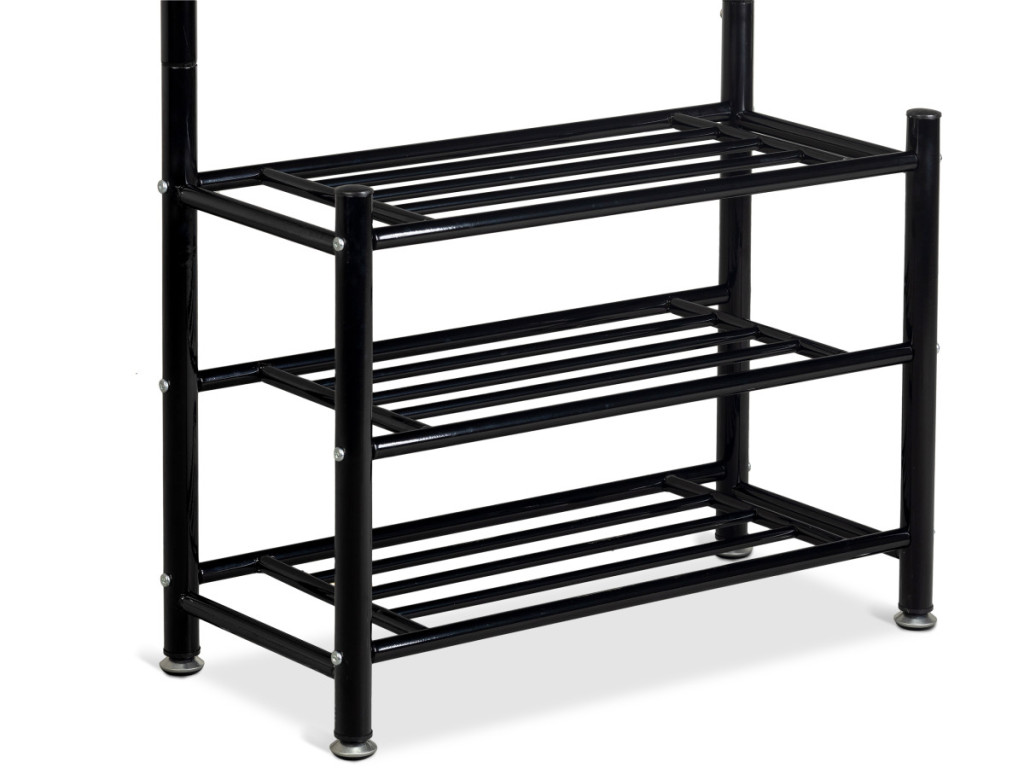 Az állvány alsó részén három funkcionális polc található, amelyekre kisebb ruhadarabokat, táskákat és akár cipőket is el lehet helyezni.