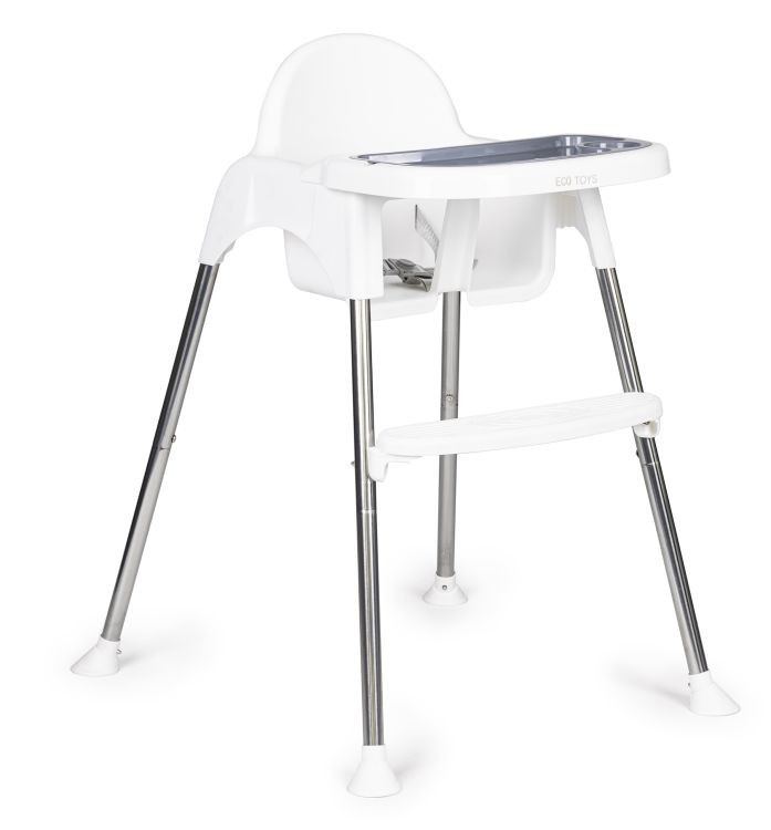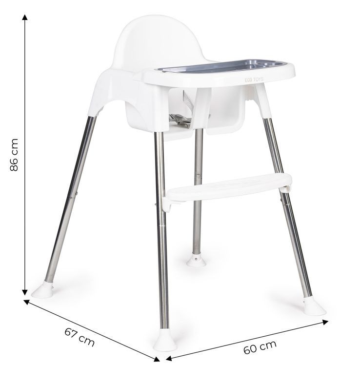 A tálca megfelelően megemelt szélei biztosítják, hogy semmi ne ömöljön a padlóra. Ezenkívül a tálcán külön hely található egy pohárnak vagy üvegnek. A szék stabil és könnyű szerkezettel rendelkezik, amely lehetővé teszi a könnyű mozgatását. A szék lábai gumitalpakkal rendelkeznek amelyek megakadályozzák az ülés elmozdulását, és ezen felül védik a padlót a karcolásoktól.