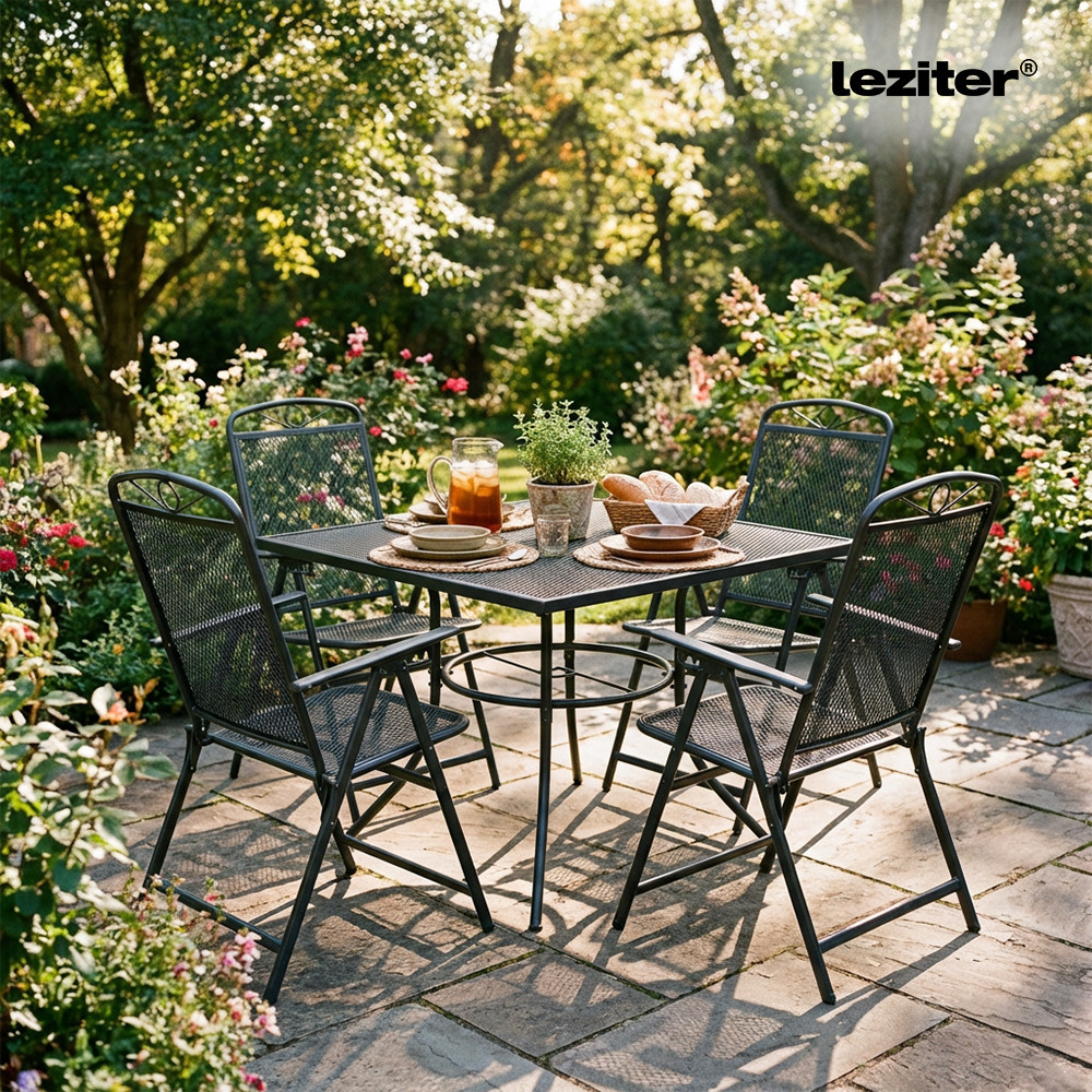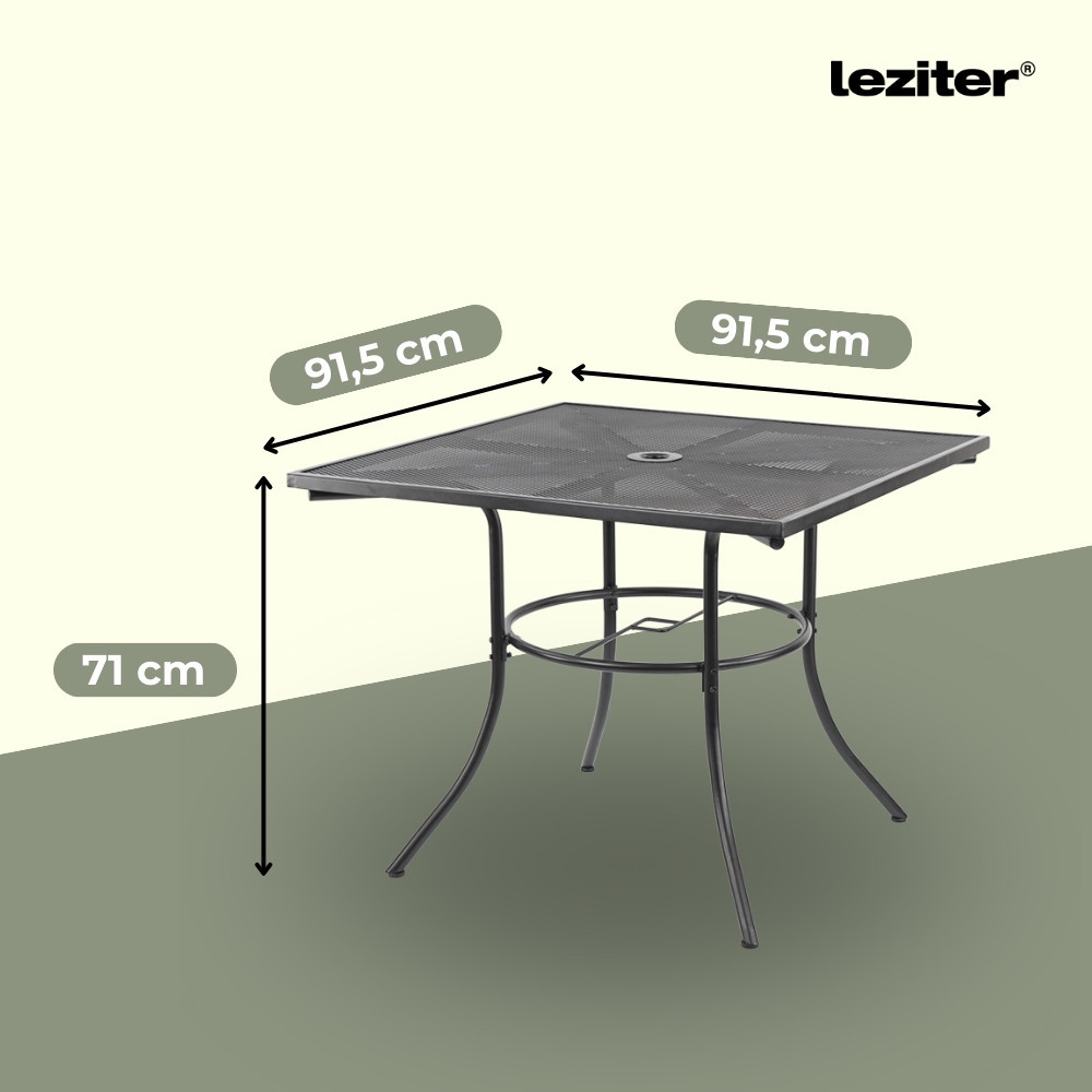 A Melfi fém mesh kerti asztal antracit színben stabil acél szerkezetével, korrózióálló és porszórt felületkezelésével, praktikus napernyőnyílásával és modern, hálós asztallapjával ideális választás kertbe, teraszra vagy erkélyre.