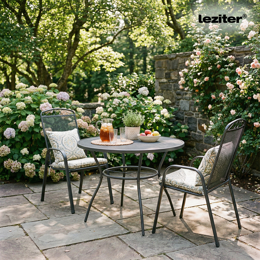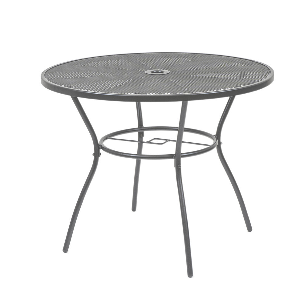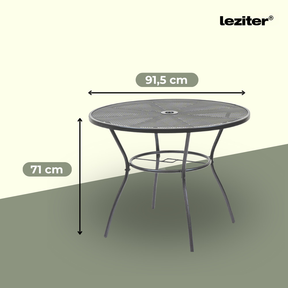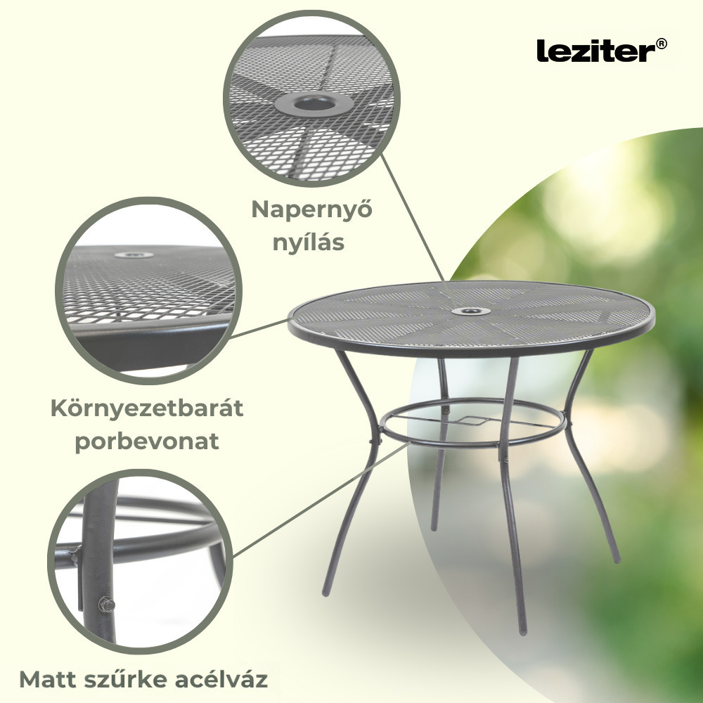 A Leziter Arko fém mesh kerek kerti asztal antracit színben stabil acél szerkezetével, korrózióálló és porszórt felületkezelésével, praktikus napernyőnyílásával és modern, hálós asztallapjával ideális választás kertbe, teraszra vagy erkélyre.