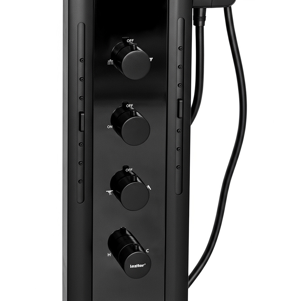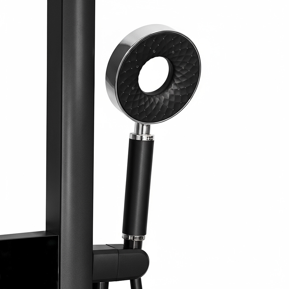 A zuhanypanel rozsdamentes acélból készült, amely garantálja a hosszú élettartamot és a prémium megjelenést. A fekete szín modern eleganciát sugároz, amely bármely fürdőszobai környezethez illeszkedik.