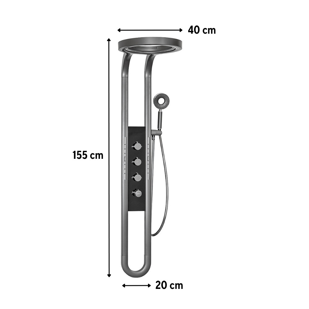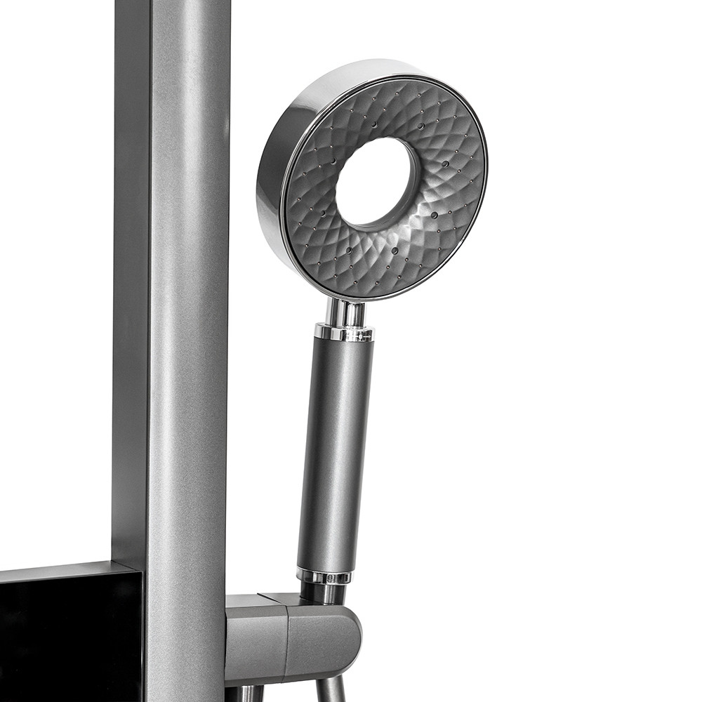 A zuhanypanel rozsdamentes acélból készült, amely garantálja a hosszú élettartamot és a prémium megjelenést. A grafitszürke szín modern eleganciát sugároz, amely bármely fürdőszobai környezethez illeszkedik.