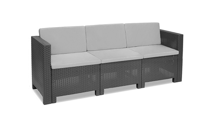 A City három személyes kerti kanapét párnával kompletten kínáljuk. Ez a nagy 57x 64 x 188 cm-es, kényelmes kanapé bármilyen környezetben tökéletesen mutat, a grafit szín és az eredeti, rattanra emlékeztető felület számos lakberendezési stílushoz illeszthető. A bútor az UV sugárzásnak és az időjárás viszontagságainak ellenálló műanyagból készült ezért időtálló, hosszútávú választás. A tisztítása is rendkívül egyszerű, az összeszerelése pedig még annál is könnyebb.