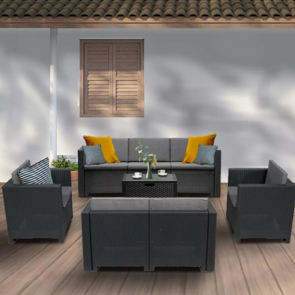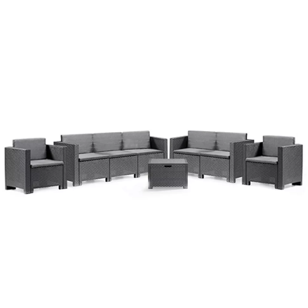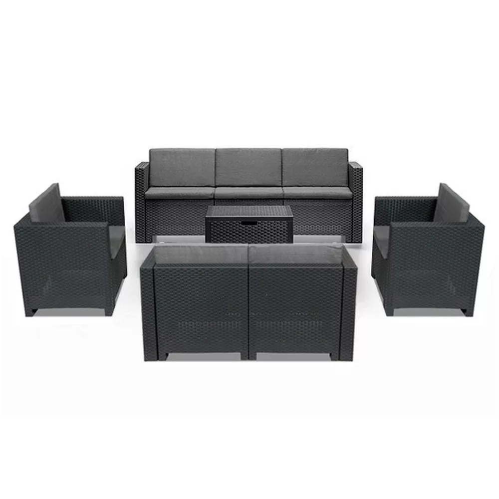 Az olasz City Large grafit színű, kényelmes és elegáns bútor szett tökéletesen alkalmas nagyobb társaságok fogadására is. A szett két 57,5x 64x 75 cm-es fotelt, egy 57,5x 64x 131 cm-es két személyes kanapét, egy 57,5x 64x 188 cm-es három személyes kanapét és egy 37x 48x 69,5 cm-es négyszögletes asztalt tartalmaz. Ez a 7 személyes kerti bútor szett lehetővé teszi, hogy az egész család és barátok kényelmesen pihenhessenek a szabadban.