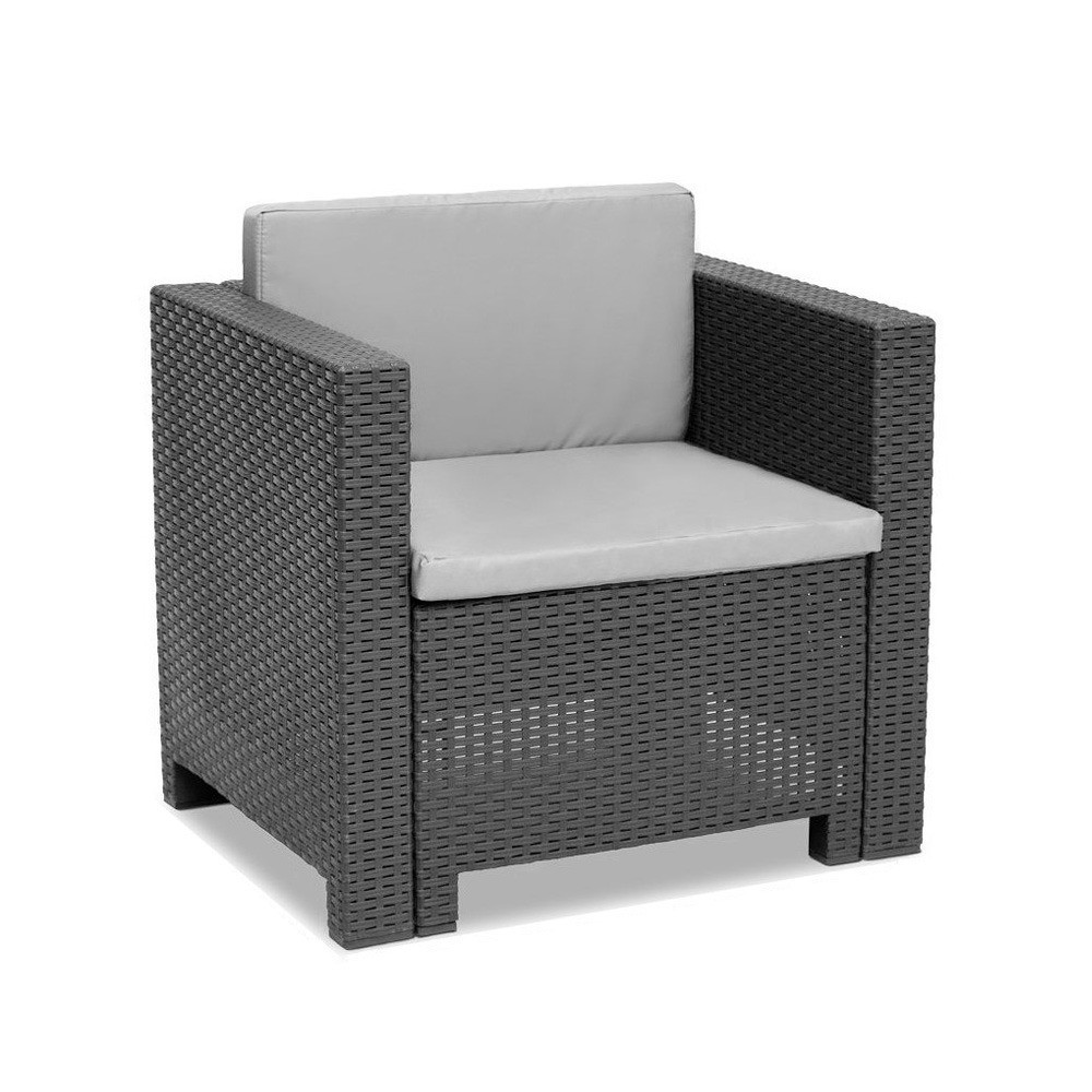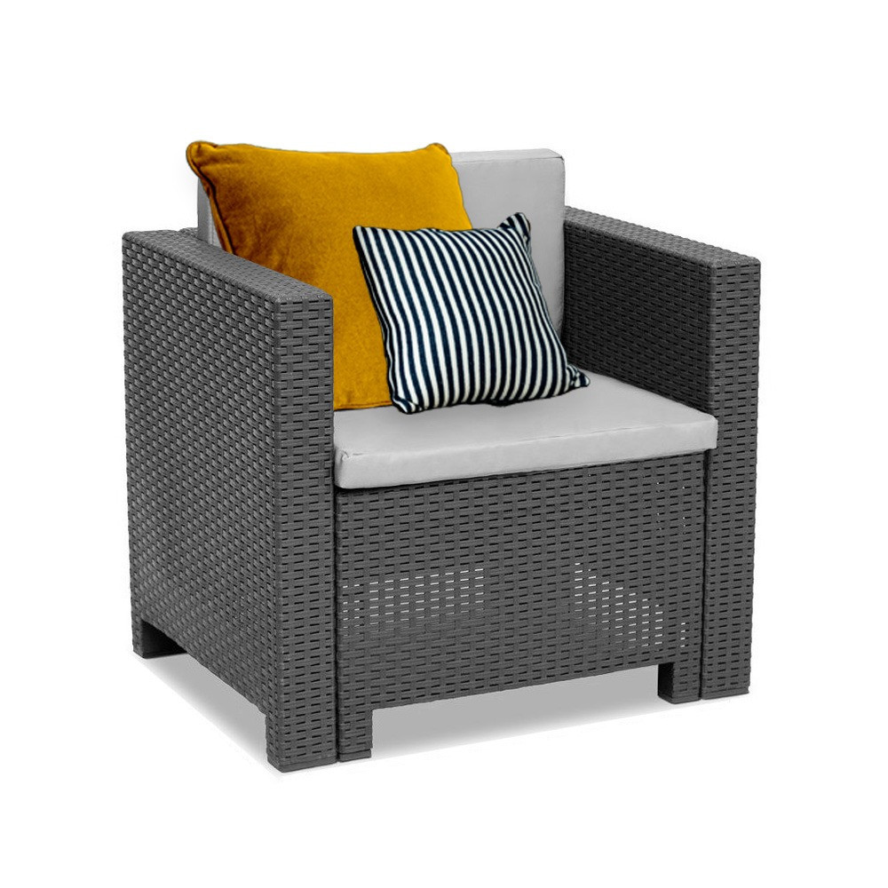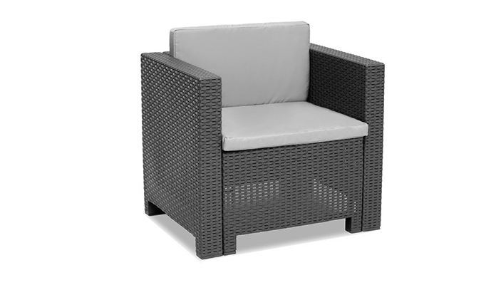 Ez egy elegáns és kényelmes kerti fotel párnával kompletten. A grafit szín és az eredeti, rattanra emlékeztető felület mindenki számára elragadó lehet. UV sugárzásnak és az időjárás viszontagságainak ellenálló műanyagból készült. Könnyű tisztán tartani és nagyon egyszerű összeszerelni. Az elegáns Rattan kerti fotel sokoldalú kiegészítő otthonához, kertjéhez vagy teraszához. A fotel nagyon tartós és igényes a megjelenése. A szék 12 hónapos garanciával rendelkezik, így bármilyen probléma esetén a vásárlók biztosak lehetnek abban, hogy a szék gyorsan és könnyen javítható vagy cserélhető.