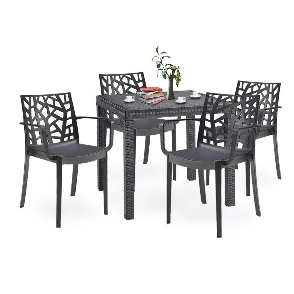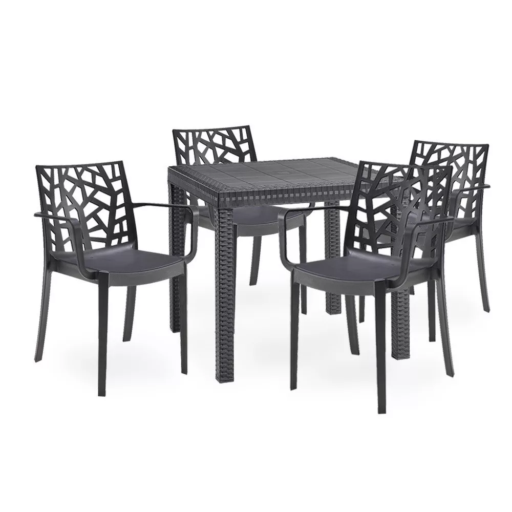Ez a grafit színű, kényelmes és elegáns Donato bútor szett négy 55x 58x 82cm-es széket és egy 80x 80x 74 cm-es négyszögletes magas asztalt foglal magába. Ez az 4 személyes kerti bútor garnitúra elegendő helyet biztosít az egész család számára, hogy a szabad levegőn tudjátok tölteni az időt. Nagyszerű választás, ha napközben szeretsz az udvaron pihenni és olvasgatni. Alkalmas családi összejövetelekhez. Ez a szett minden udvart és teraszt színesebbé tesz modern megjelenésével.
