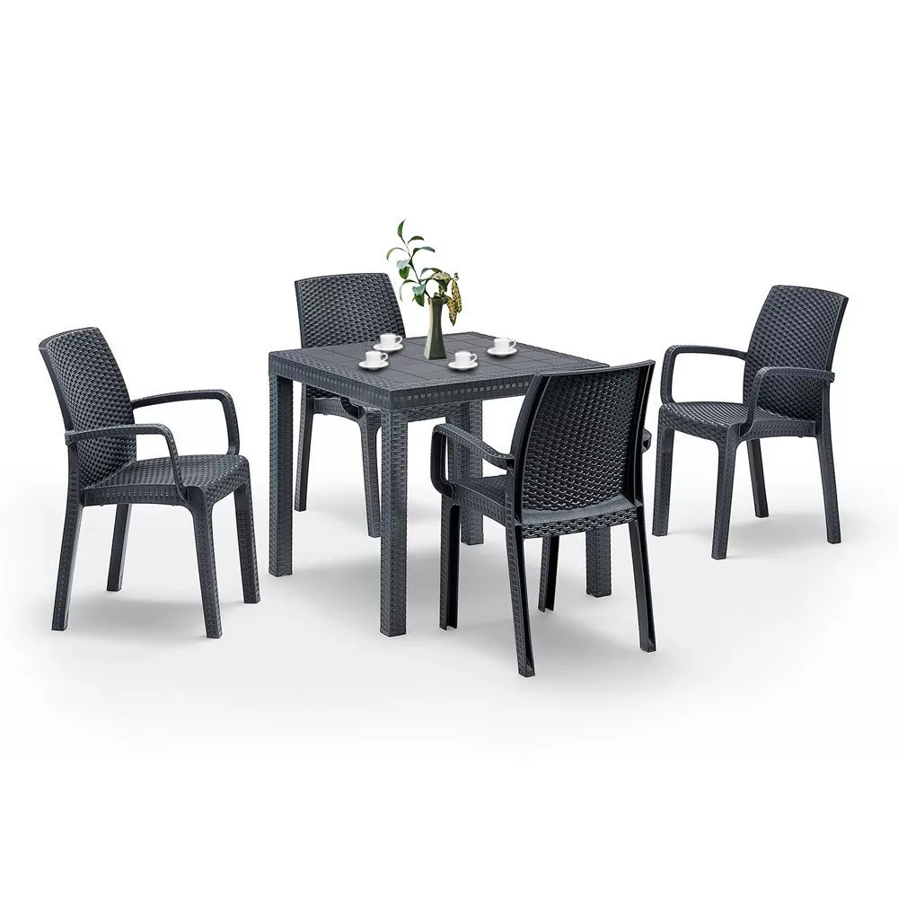 Ez a grafit színű, kényelmes és elegáns Petri bútor szett négy 57x 59x 86 cm-es széket és egy 80x 80x 74 cm-es négyszögletes magas asztalt foglal magába. Ez az 4 személyes kerti bútor szett elegendő helyet biztosít az egész család számára, hogy a szabad levegőn tudjátok tölteni az időt. Nagyszerű választás ha napközben szeretsz az udvaron pihenni és olvasgatni. Alkalmas családi összejövetelekhez. Ez a szett minden udvart és teraszt színesebbé tesz modern megjelenésével.