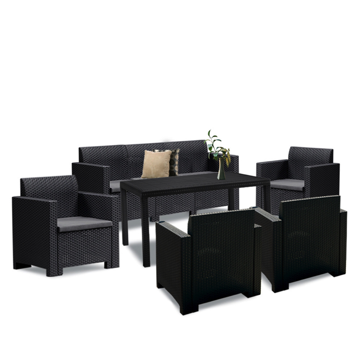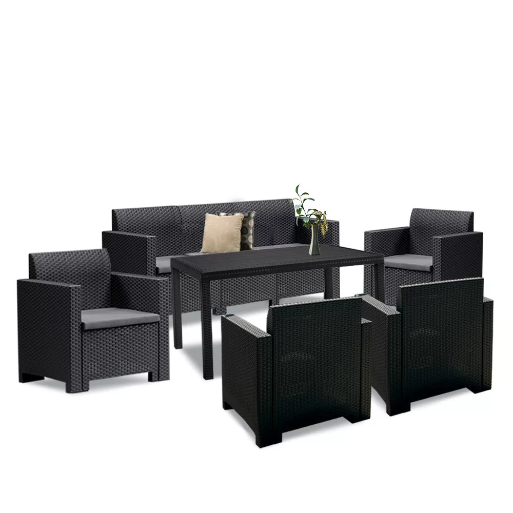 7 személy kényelmesen leülhet a kertben, vagy a teraszon, ha ezt a kültéri szettet választod. Olyan érzés lesz, mintha a nappaliban lennétek, hiszen a kanapék és fotelek kényelmes környezetet termetenek egy kellemes beszélgetéshez, vagy grillpartihoz.