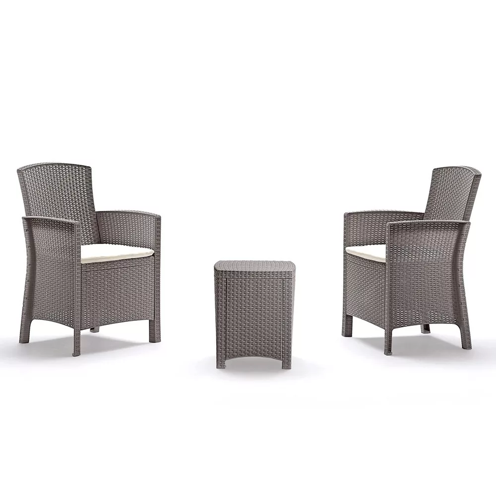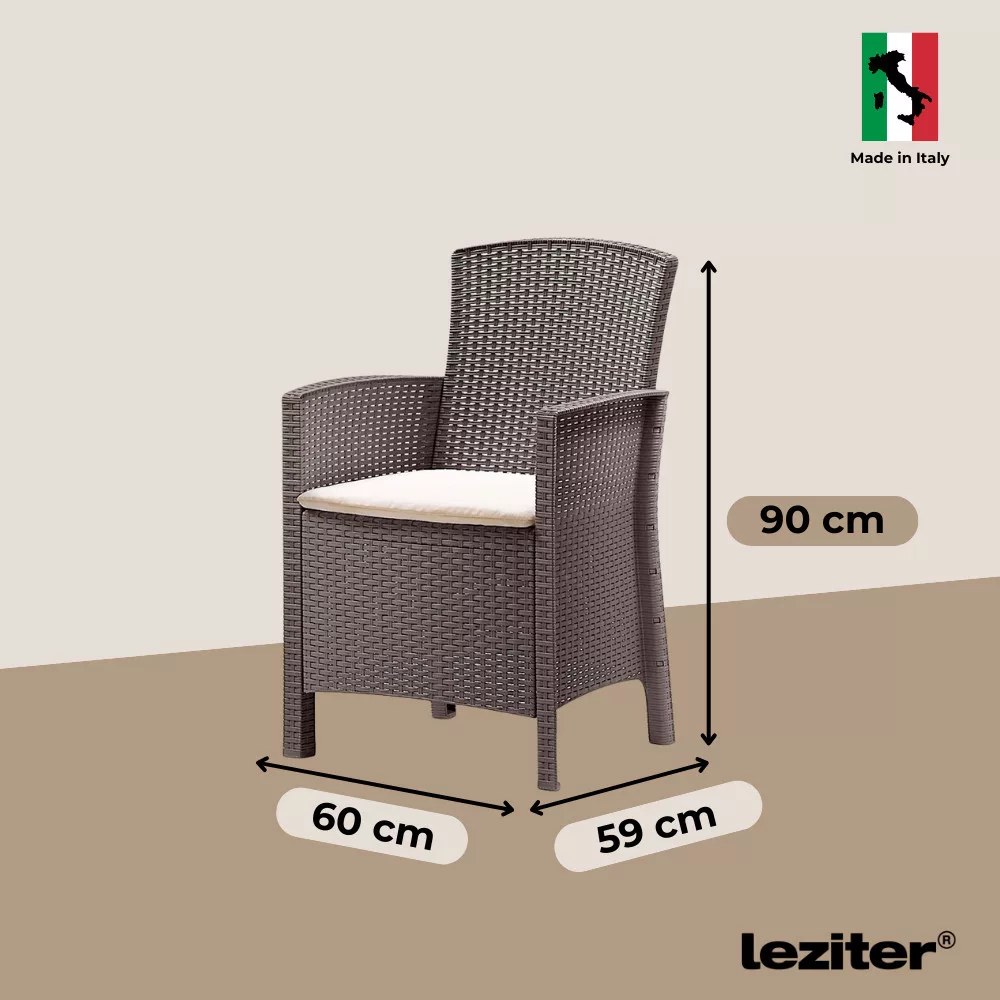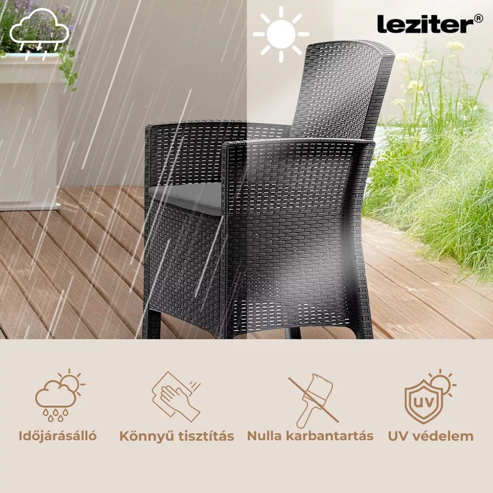 A cappuccino árnyalatú, rattan stílusra emlékeztető felület természetes és harmonikus összhatást teremt. A két kényelmes fotel és a hozzá illő négyszögletes asztal tökéletesen alkalmas reggeli kávézásokhoz, délutáni beszélgetésekhez vagy esti kikapcsolódáshoz.
