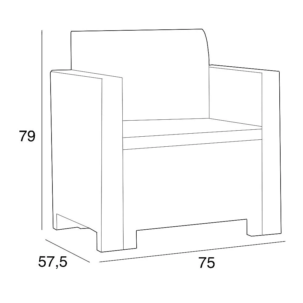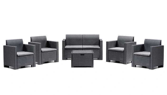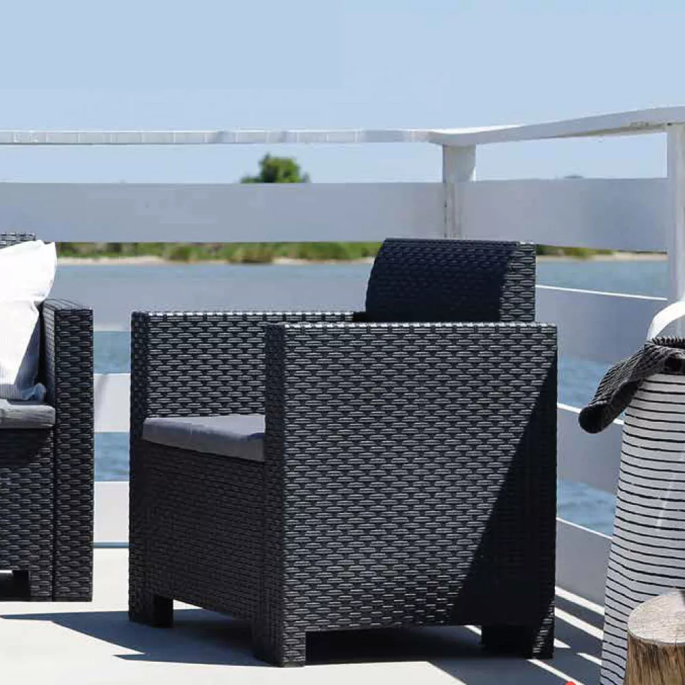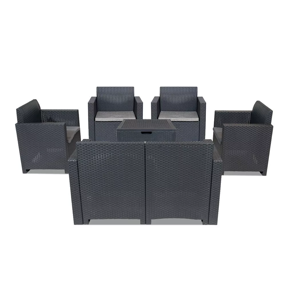 Ez egy Olaszországban gyártott grafit színű, kényelmes és elegáns bútor szett négy 57,5x 75x 79 cm-es fotelt, egy 57,5x 79x 131 cm-es két személyes kanapét és egy 40x 64x 64 cm-es négyszögletes asztalt foglal magába. Ez a 6 személyes kerti bútor garnitúra elegendő helyet biztosít az egész család számára, hogy mintha a nappaliban ülnének, mégis a szabad levegőn tudják tölteni az időt. Nagyszerű választás akkor is, ha napközben szeretsz az udvaron pihenni és olvasgatni, elterüülve egy kanapén. Alkalmas családi összejövetelekhez, üzleti rendezvényekhez, hisz minden teret moderné és hangulatossá változtat megjelenésével.