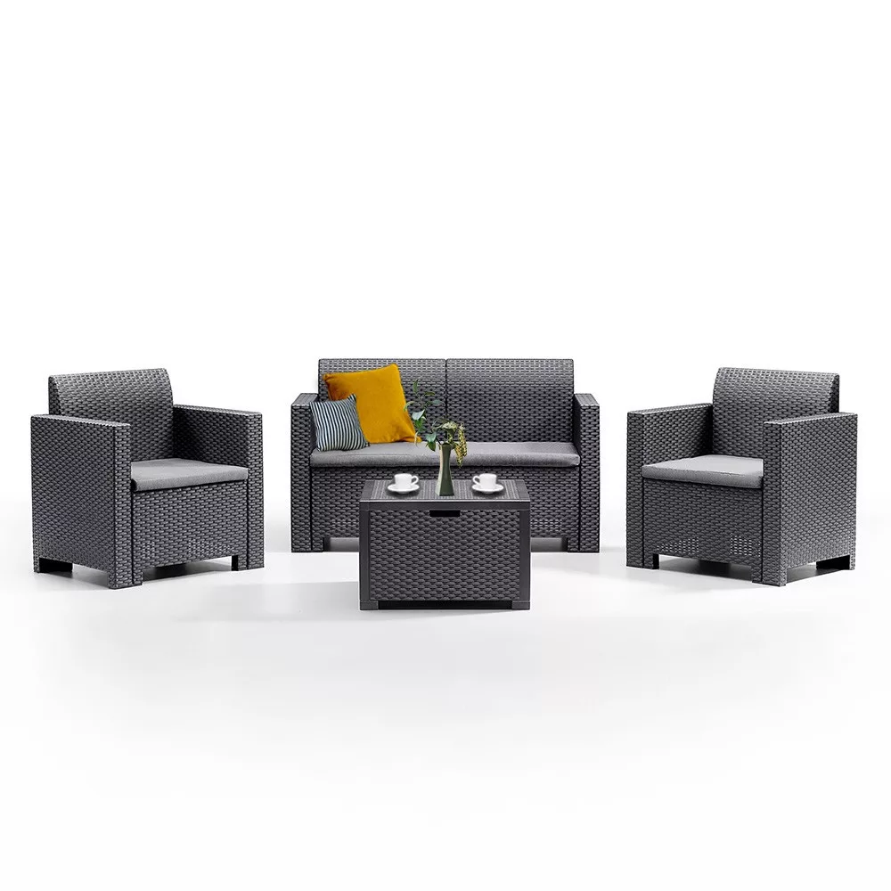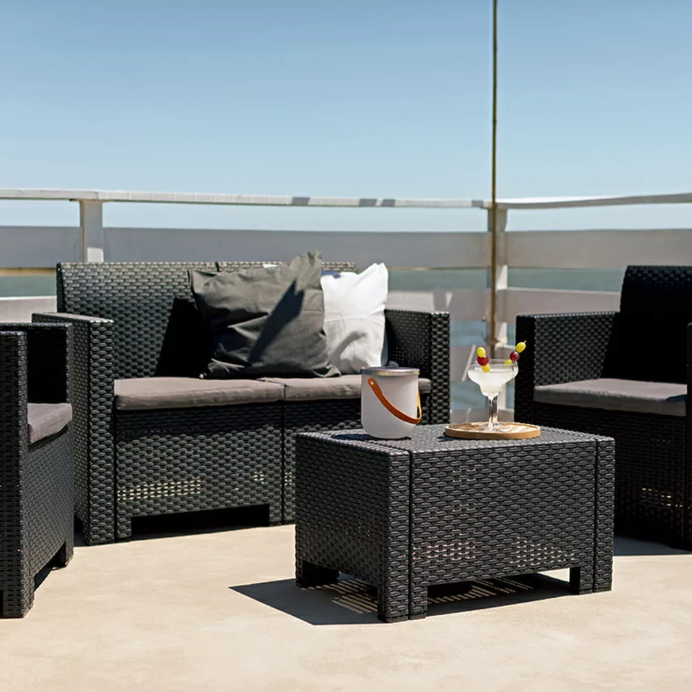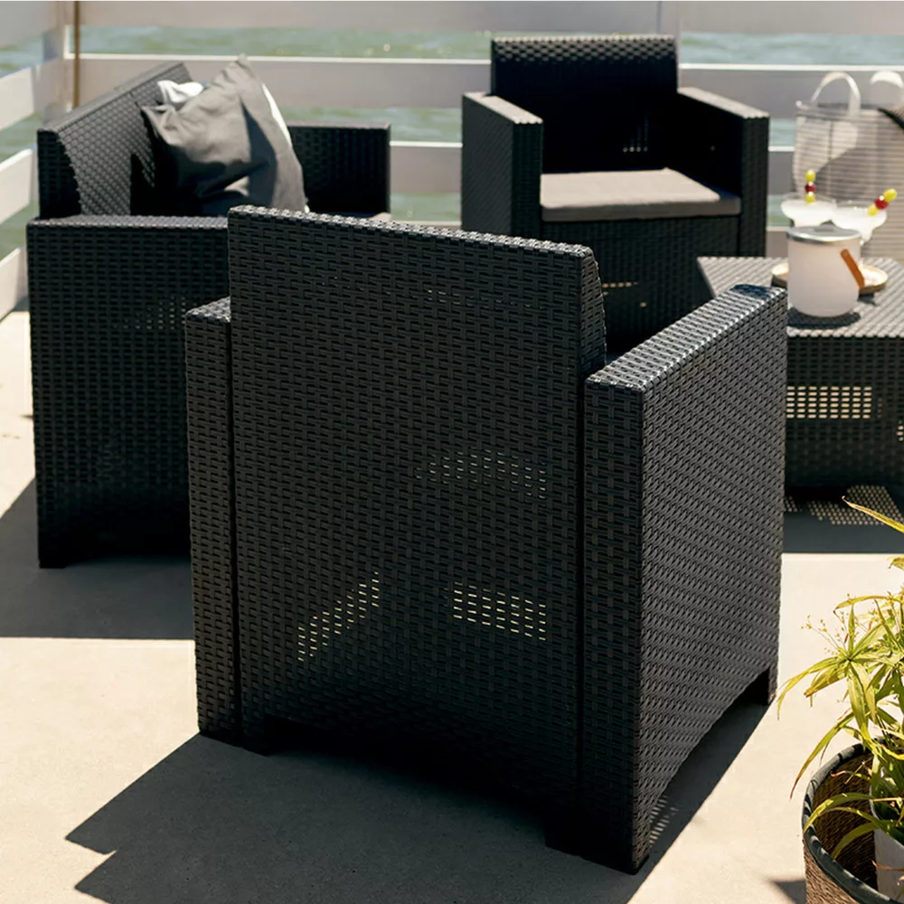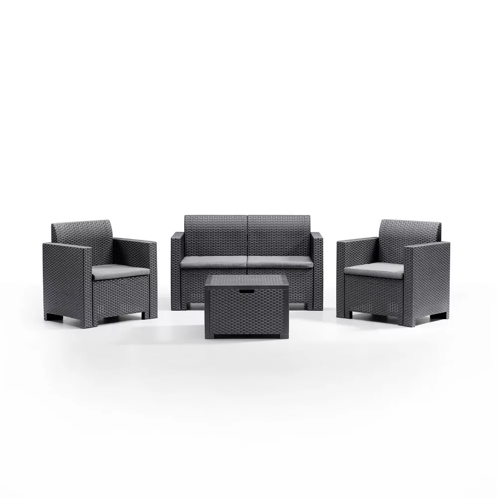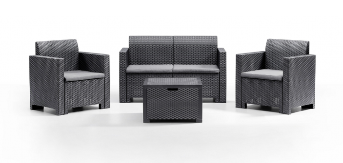 A grafit árnyalatokban elérhető szetthez szürke párnák társulnak, melyek a maximális kényelmet nyújtanak a divatos és szemre való megjelenés mellett. A bútorok erős és tartós műanyagból készültek, mely nagyrészt ójrahasznosított, így fenntarthatóbb válaszásnak bizonyul.