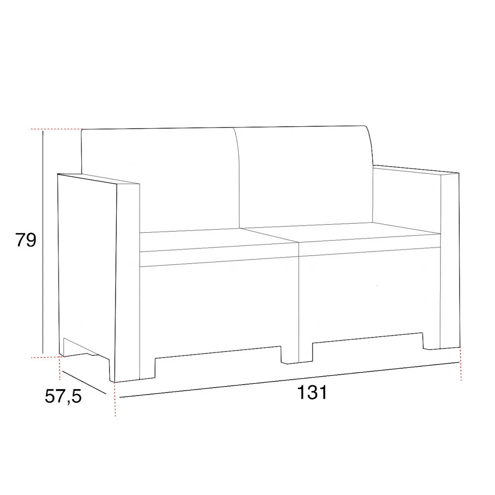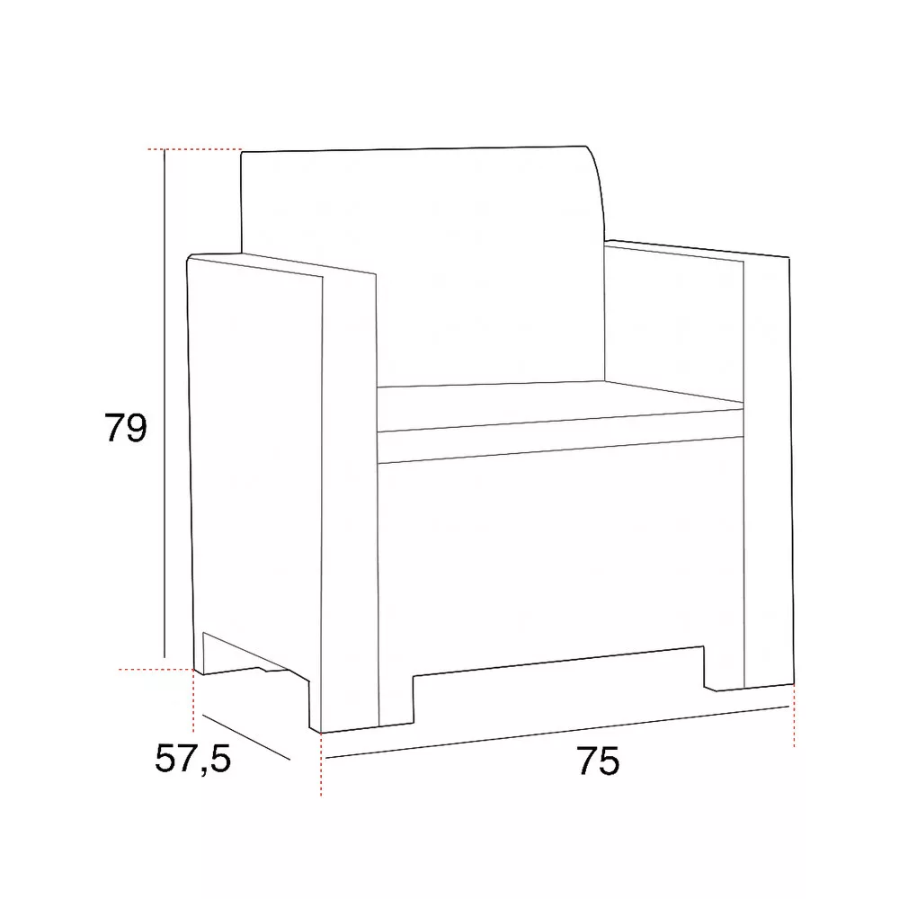 Ez a grafit színű rattan kerti bútor szett két darab 57,5x 75x 79 cm-es fotelből, egy 57,5x 79x 131 cm-es és egy 40x 64x 64cm-es négyszögletű asztalból áll. Ez egy olasz gyártmányú, kiváló minőségű termék, amely a legjobb minőségű fröccsöntött műanyagból készült.
