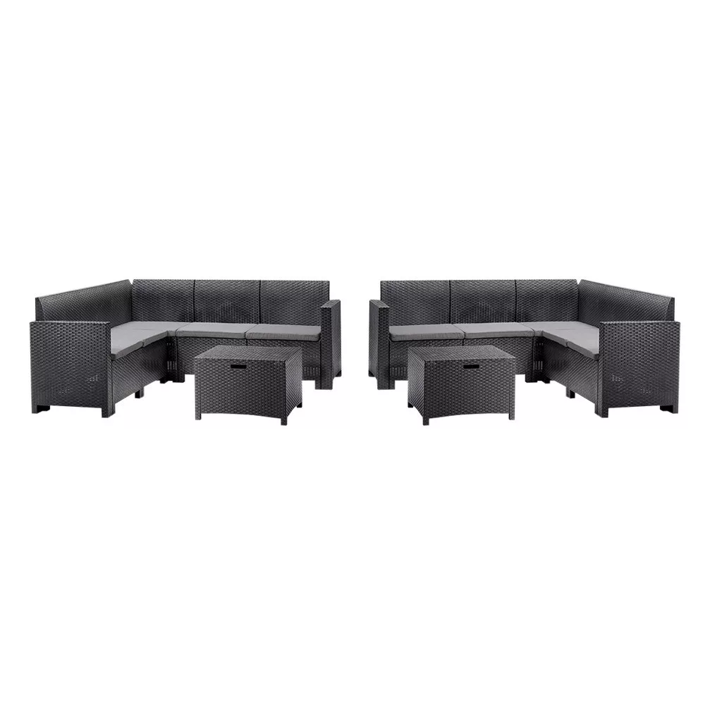 Tökéletes kerti összejövetelre: A Nero V 10 sarok kerti bútor garnitúra elegáns és praktikus kiegészítője lehet minden terasznak és kertnek. Ez a modern grafit színű bútor szett két öt személyes, kényelmes sarokkanapét és egy multifunkcionális négyszögletes asztalt kínál, amely tárolóként is szolgálhat. Ez a szett tökéletes választás nagyobb családi vagy baráti összejövetelekhez. A szett méreteinek köszönhetően bőven elegendő helyet biztosít az egész család számára.