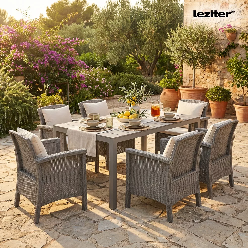 A garnitúrához 6 db Venus karfás műanyag szék tartozik, amelyek rattan hatású felületükkel és ergonomikus kialakításukkal nemcsak látványos, hanem igazán kényelmes megoldást nyújtanak a szabadtéri időtöltéshez. A kényelmet a tartozék szürke ülőpárna teszi teljessé – ideális egy hosszú ebédhez vagy egy baráti beszélgetéshez a kertben.