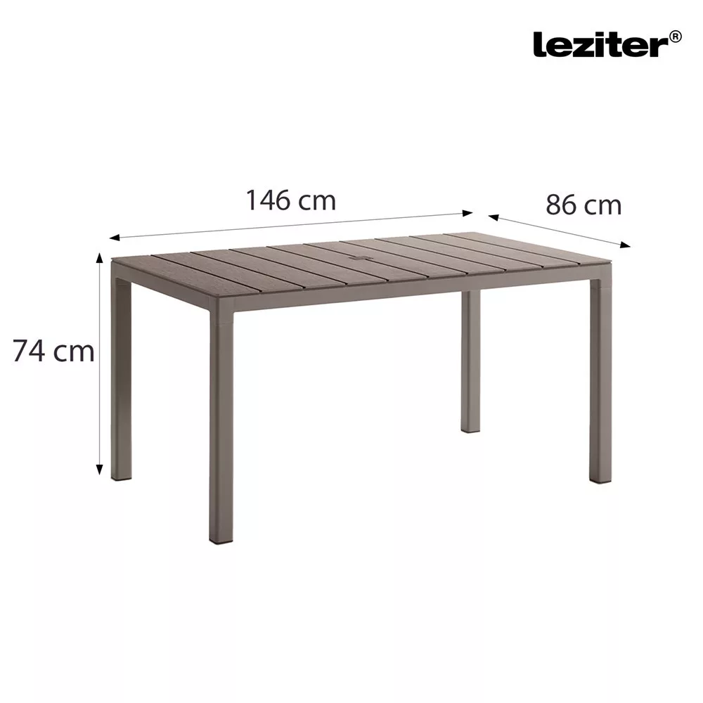 A Tulsa műanyag kerti asztal a szett központi eleme. Modern, sima felülete deszkázat mintázatot idéz, amely remekül illik bármilyen kültéri térhez. Funkcionális, stabil és könnyen kezelhető, ideális választás akár hétköznapi, akár ünnepi étkezésekhez.
