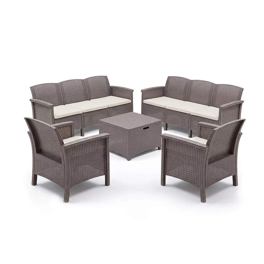 A Venus II 8 személyes kerti bútor garnitúra ideális választás nagyobb társaságok számára. A két fotel és a két három személyes kanapé tágas, jól szervezhető ülőhelyet biztosít, amely tökéletes családi összejövetelekhez vagy baráti találkozókhoz. A cappuccino szín meleg, elegáns hangulatot teremt, a rattan hatású felület pedig természetes megjelenést biztosít.