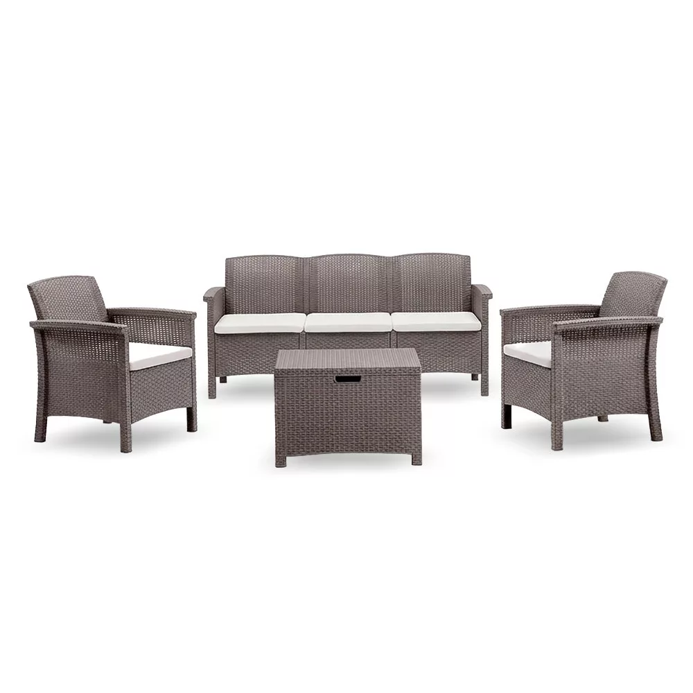 A Venus II 5 személyes kerti bútor garnitúra ideális választás kisebb családok vagy baráti társaságok számára. A két fotel, a három személyes kanapé és az asztal harmonikus elrendezést biztosít, amely kényelmes pihenést tesz lehetővé kertben, teraszon vagy erkélyen. A cappuccino szín modern megjelenést kölcsönöz, a rattan hatású felület pedig elegáns összhatást teremt.