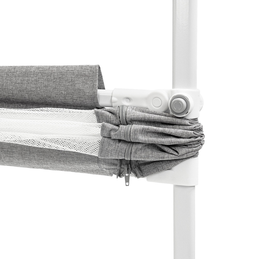 A 300D Oxford szövet és a poliészter hálós anyag kombinációja egyszerre erős és jól szellőző. A hálós felület biztosítja a folyamatos rálátást, miközben kényelmes és biztonságos környezetet teremt alvás közben.