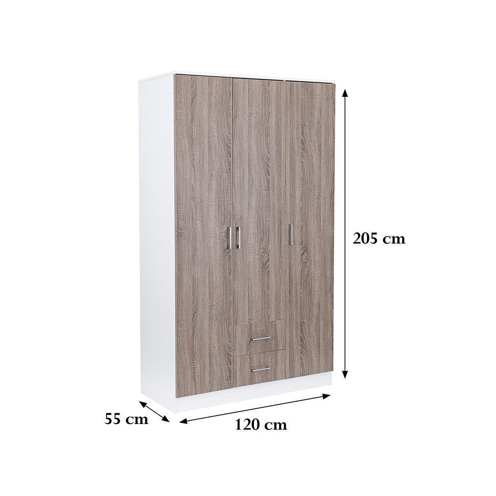 Az elegáns yorki tölgy front és a fahatású fehér korpusz ötvözete tökéletes harmóniát teremt a nappaliba vagy a hálószobába egyaránt. A 205 cm magas, 120 cm széles és 55 cm mély gardróbszekrény ideális választás mindenki számára, aki szeretné rendszerezni ruháit és kiegészítőit.