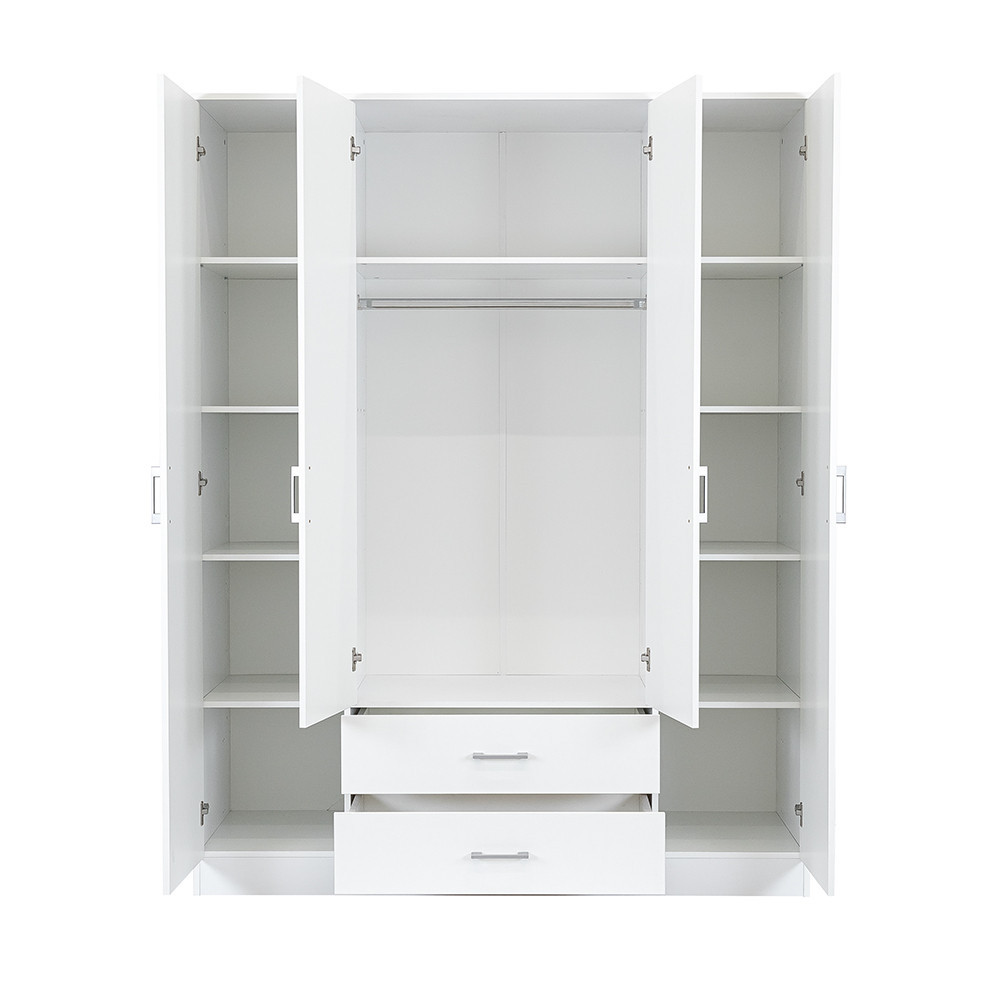 A matt króm hatású műanyag fogantyúk modern megjelenést kölcsönöznek, míg a két szárnyú nyílóajtó és a polcrendszerekhez kialakított ajtók révén az egész szekrény belseje könnyen áttekinthető, így minden ruhadarab és tárgy könnyedén elérhető. A 11 polc és a két görgős fiók bőséges tárolóhelyet biztosít legyen szó ágyneműről, szezonon kívüli ruházatról vagy fehérneműkről.